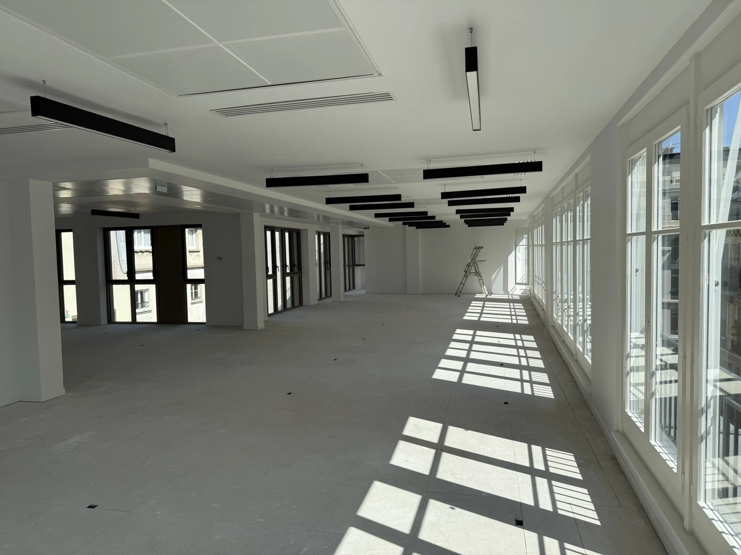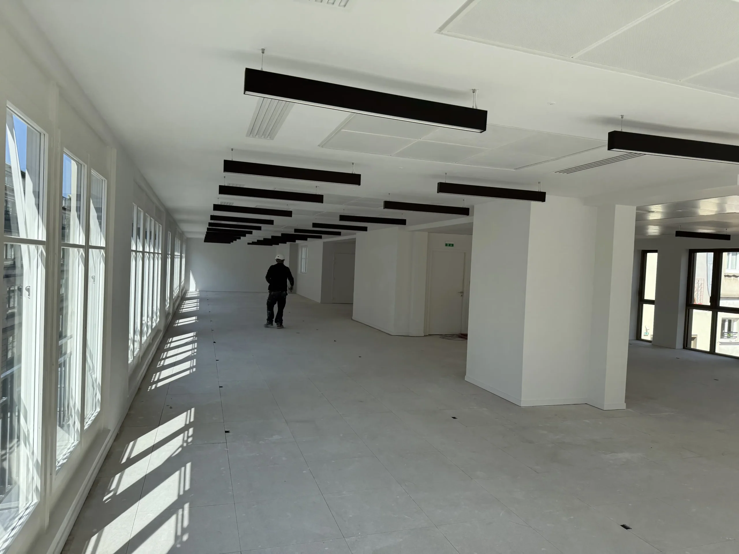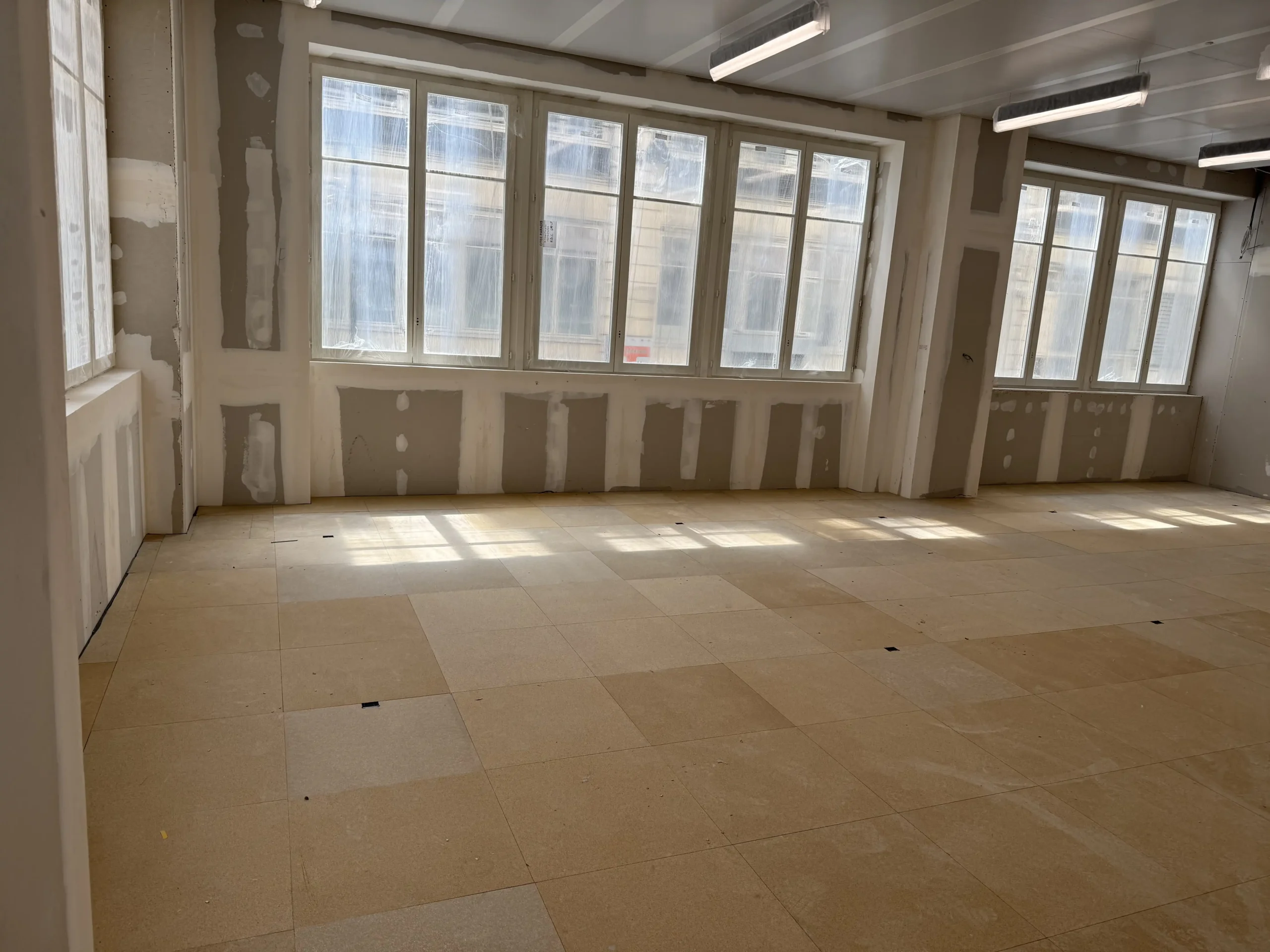 Chantier de plancher technique neuf en dalles agglomérées Burobox, posé sur un plénum de 60 à 80mm.