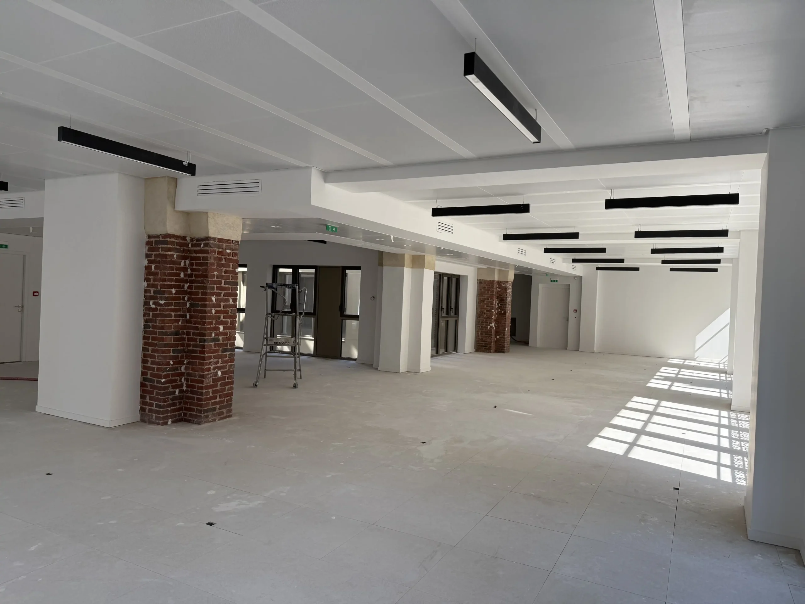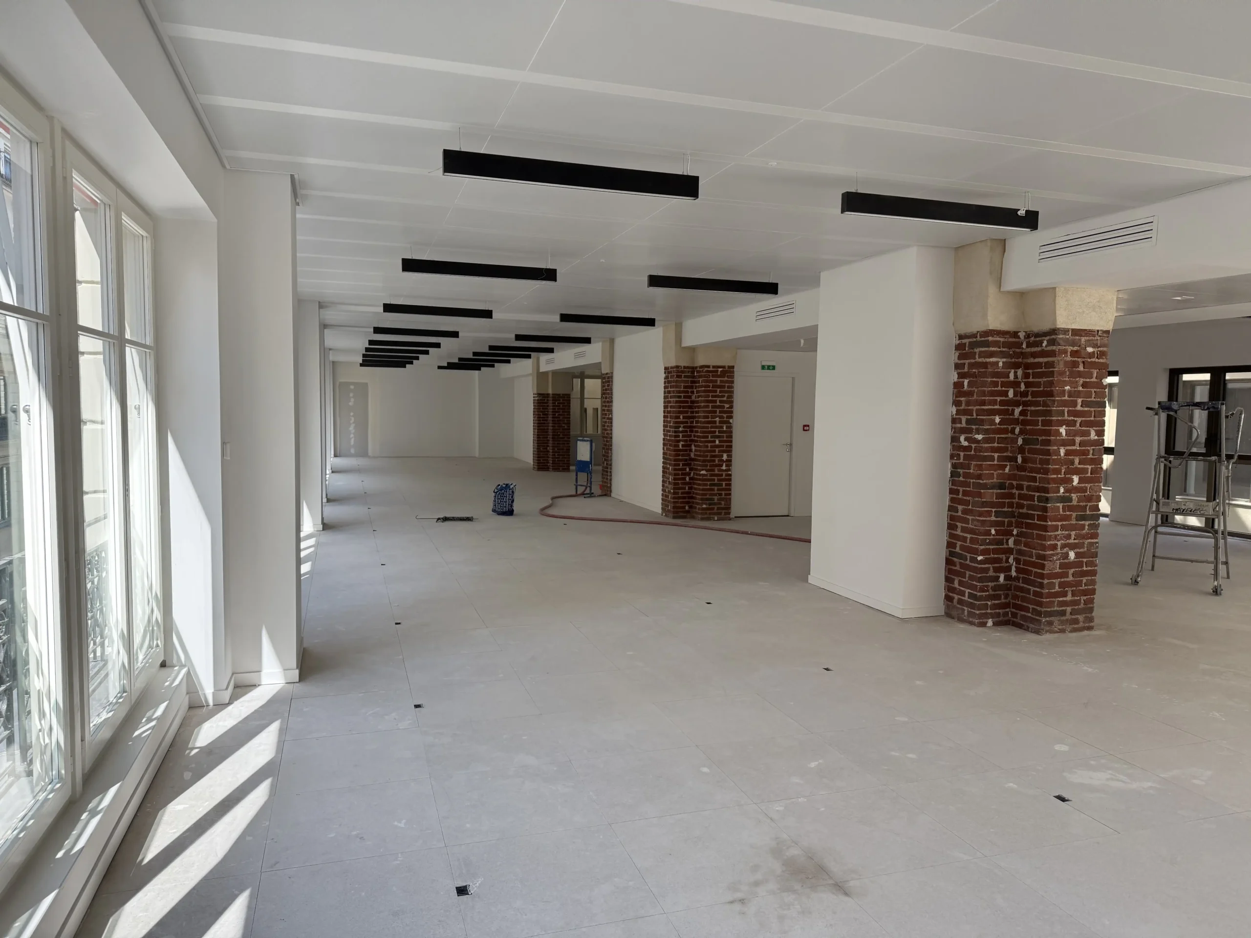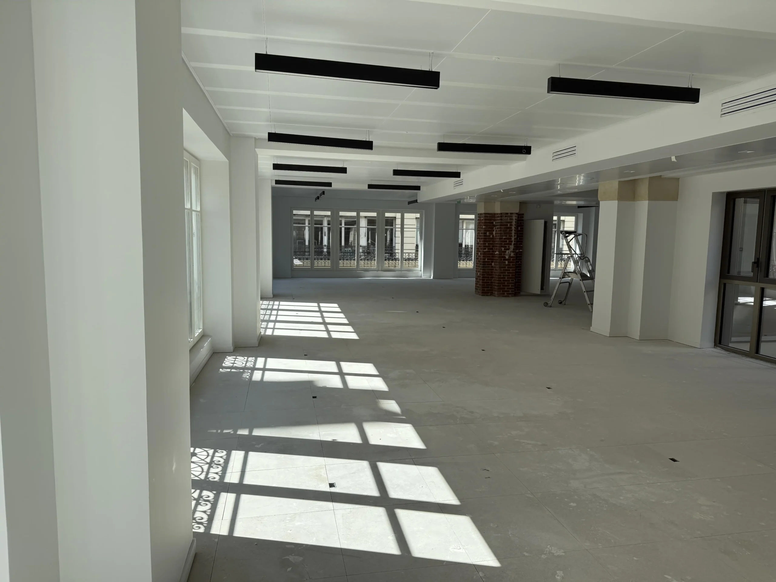 Chantier de plancher technique neuf en dalles agglomérées Burobox, posé sur un plénum de 60 à 80mm.