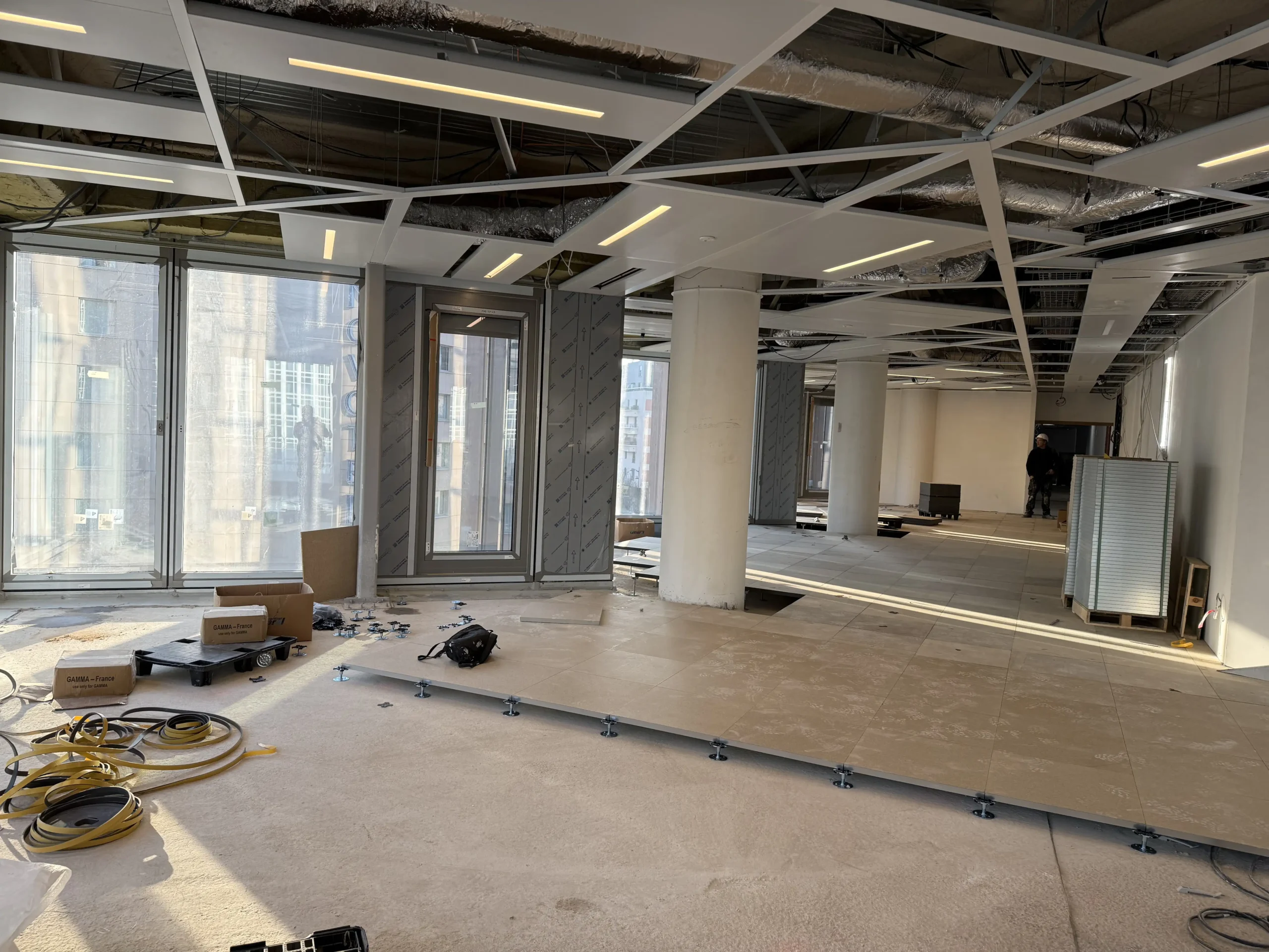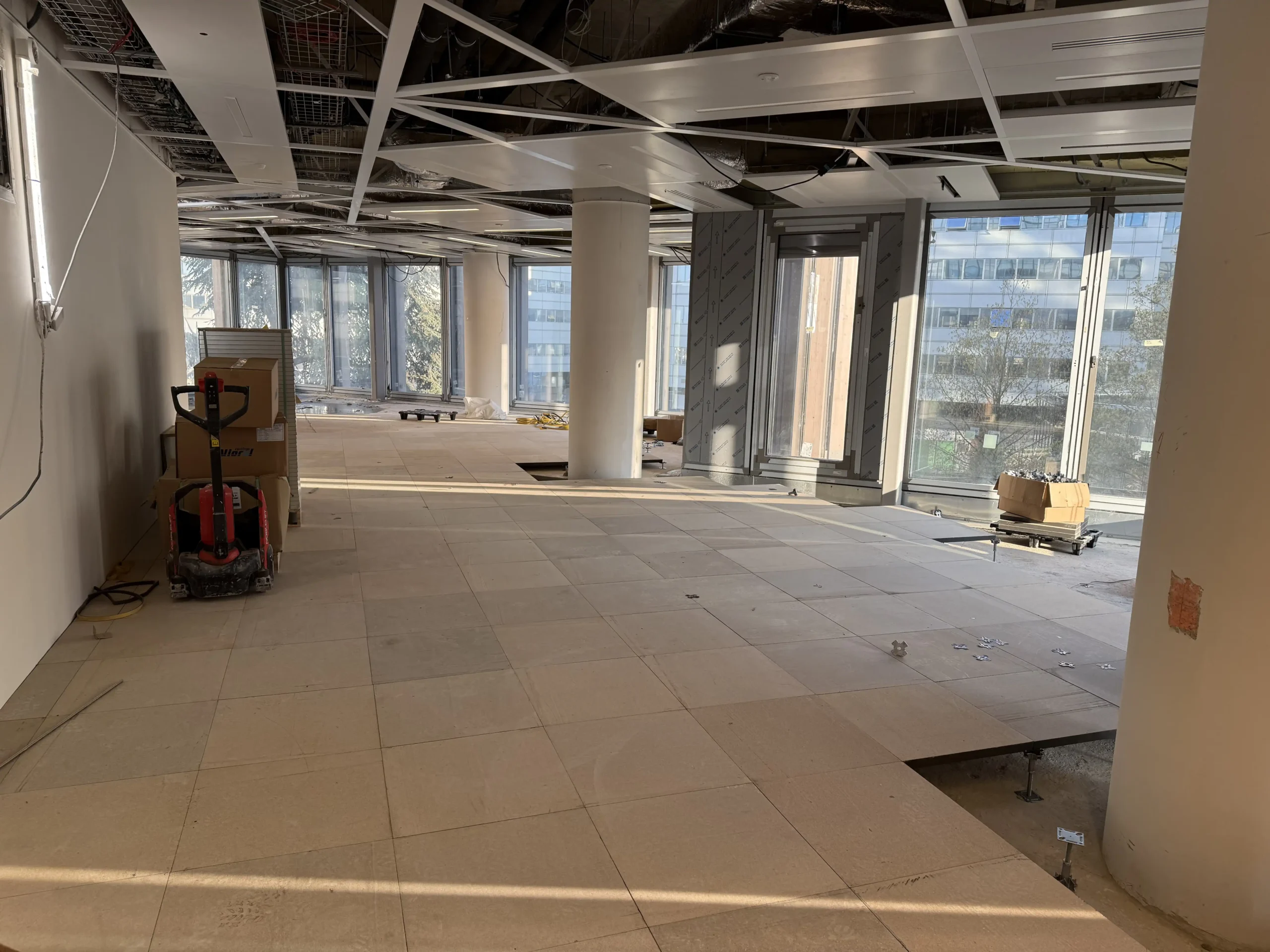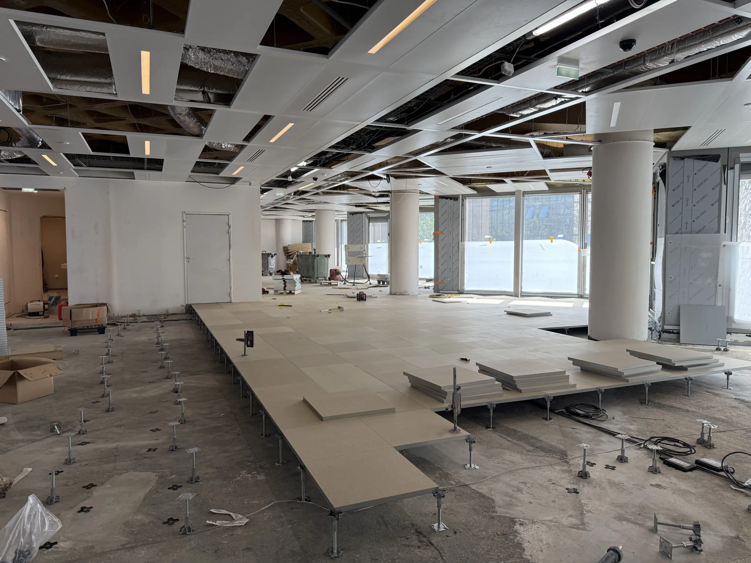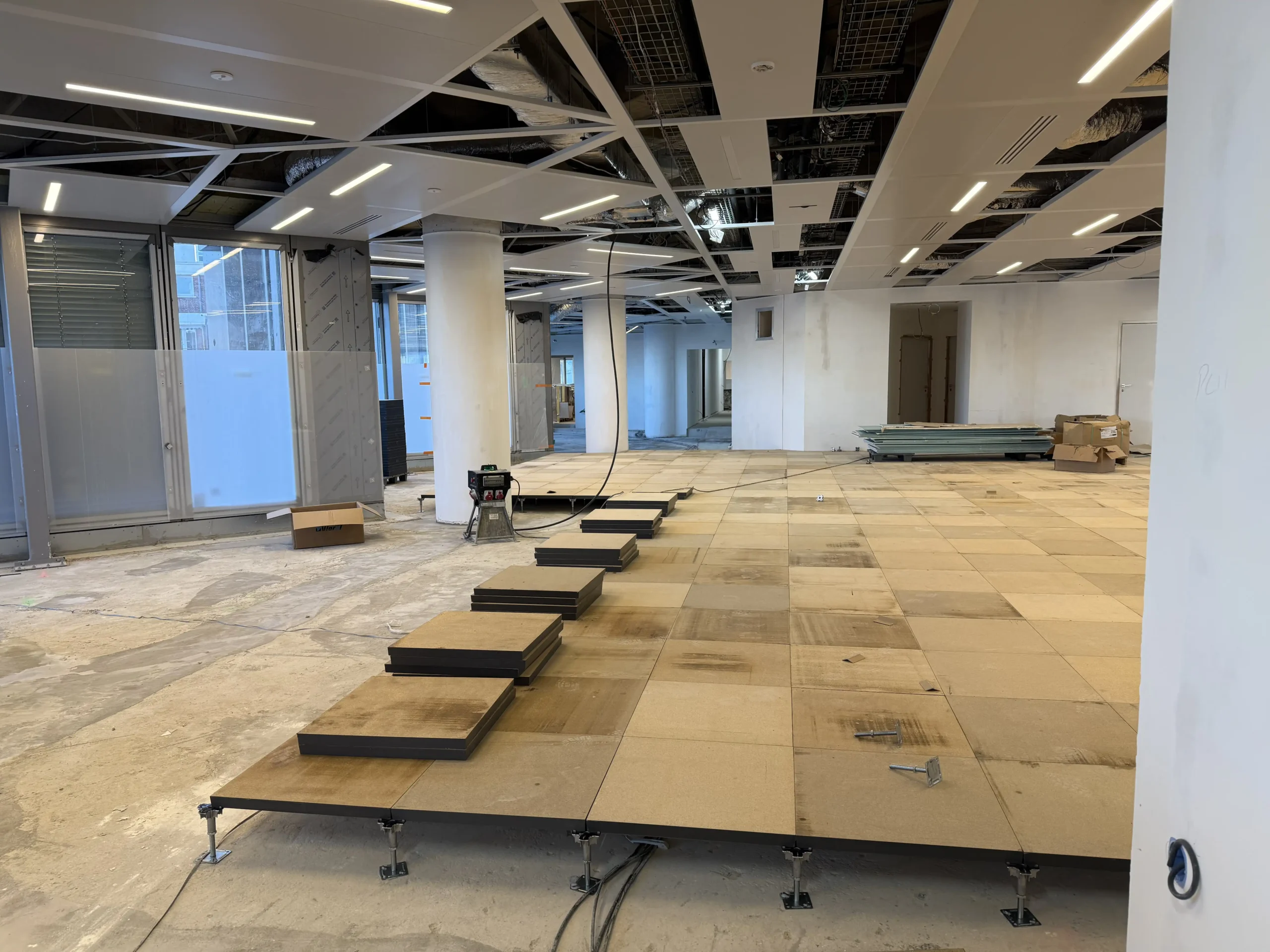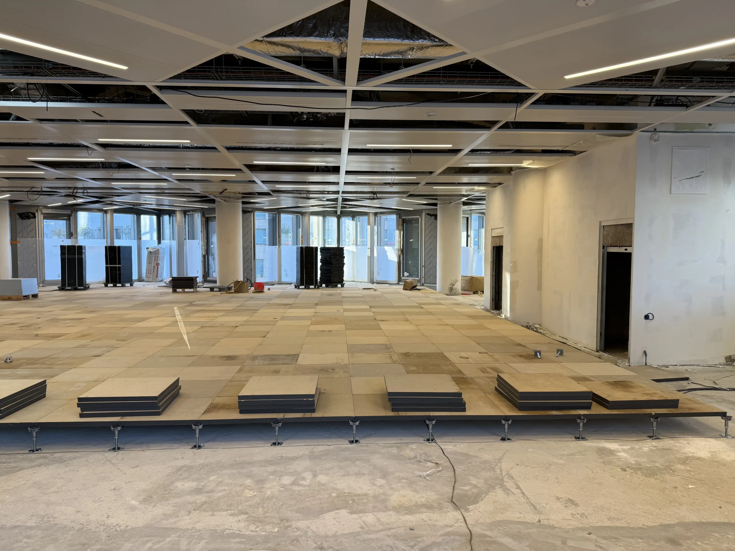 Chantier de faux plancher technique neuf et de réemploi, en dalles agglomérées posées sur un plénum de 50 à 200 mm.