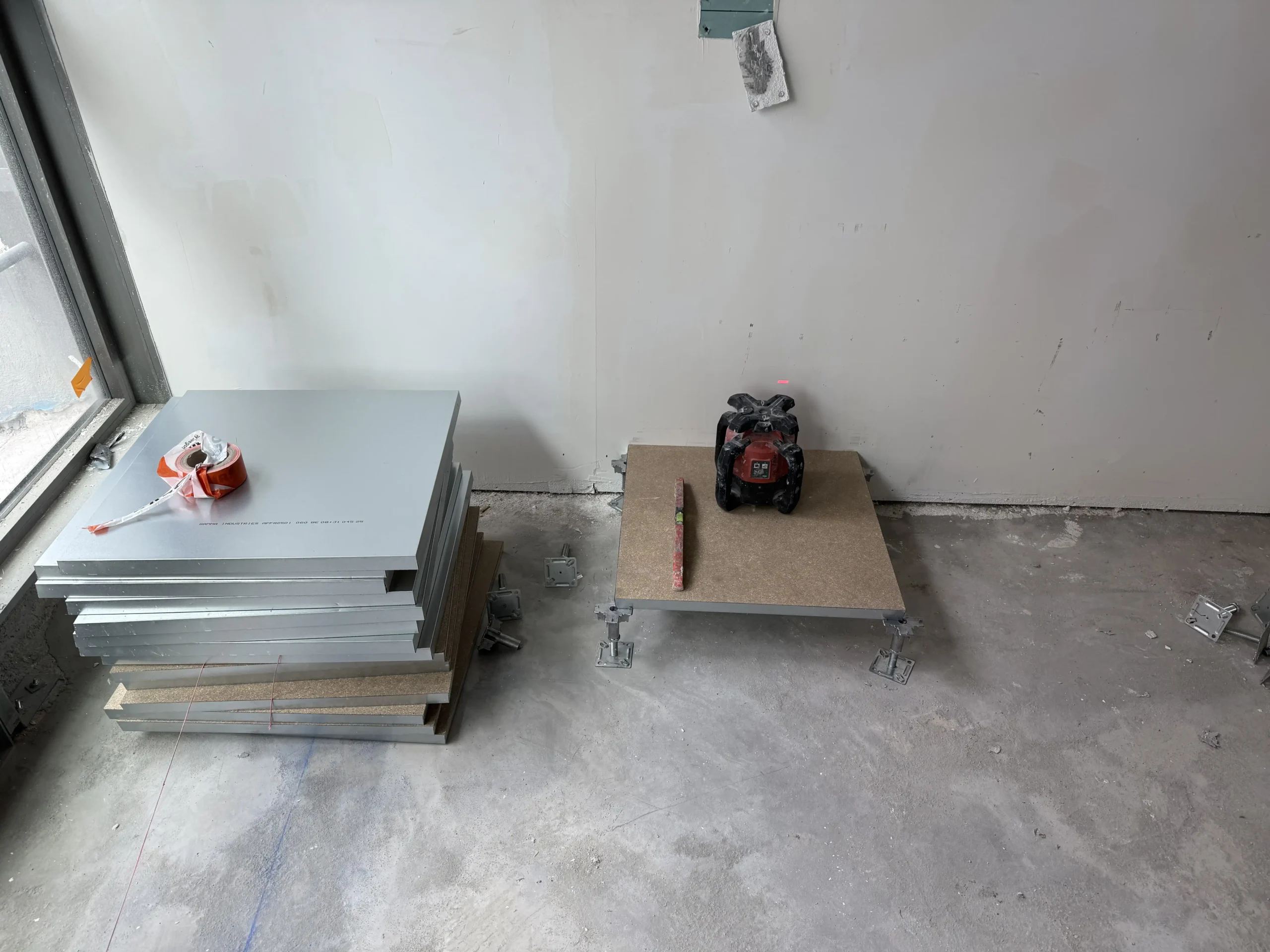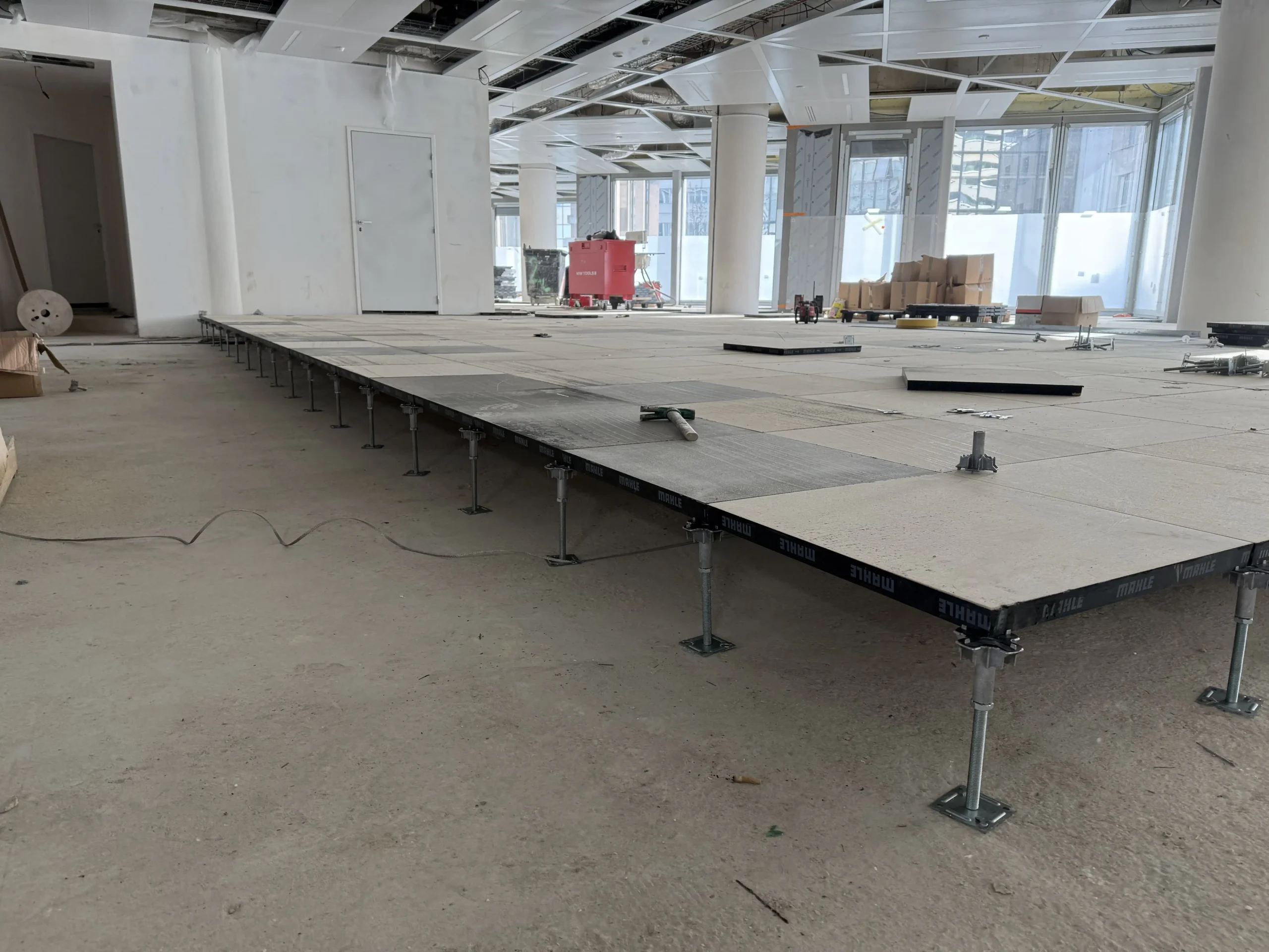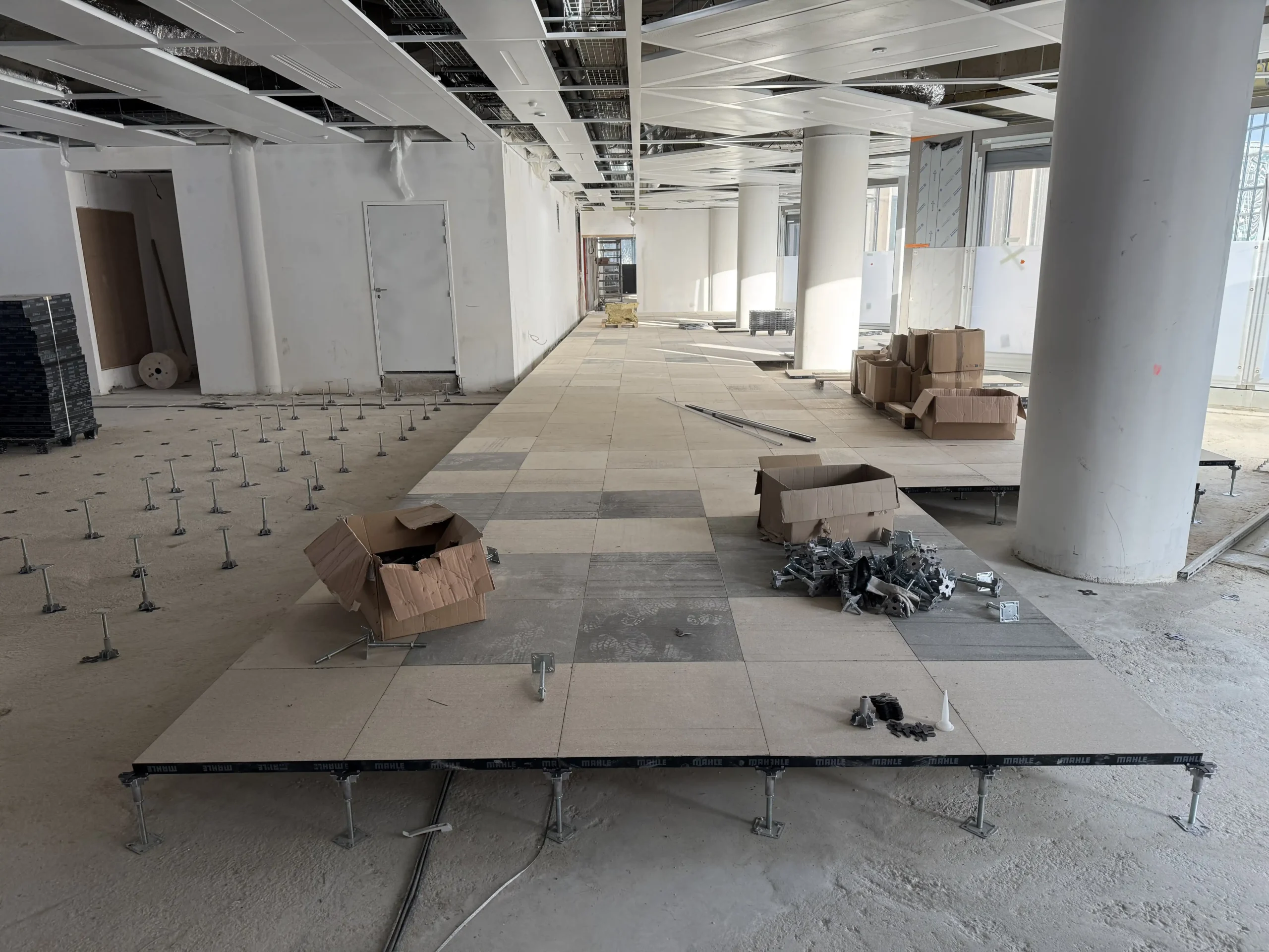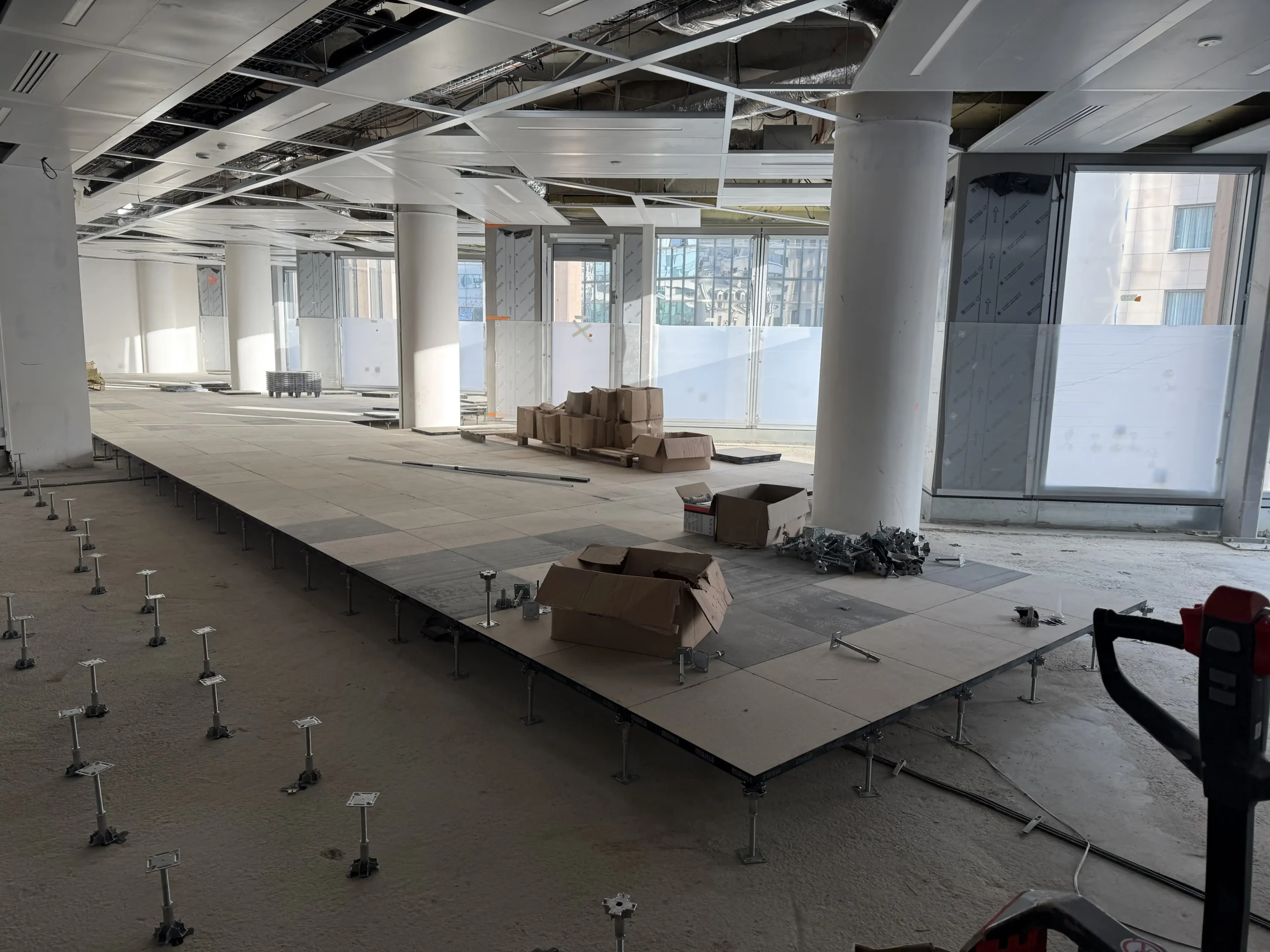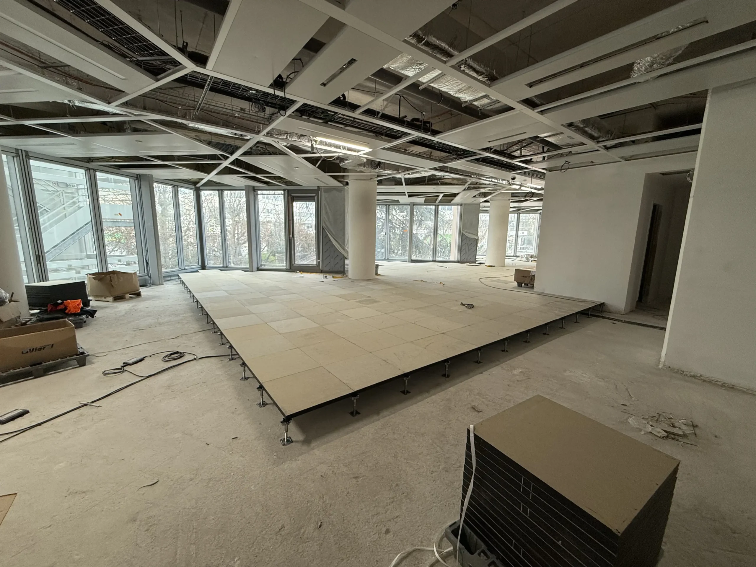 Chantier de faux plancher technique neuf et de réemploi, en dalles agglomérées posées sur un plénum de 50 à 200 mm.