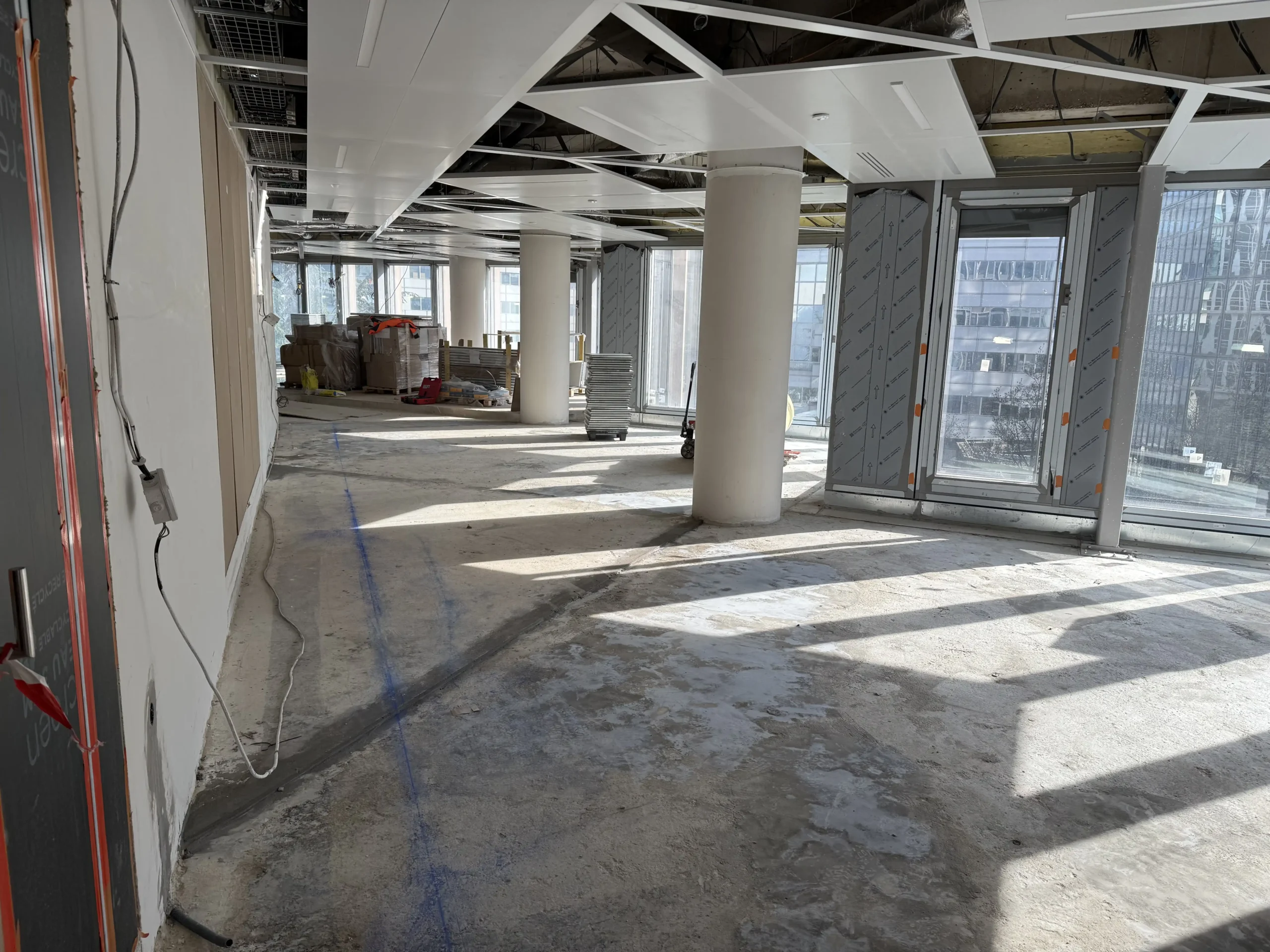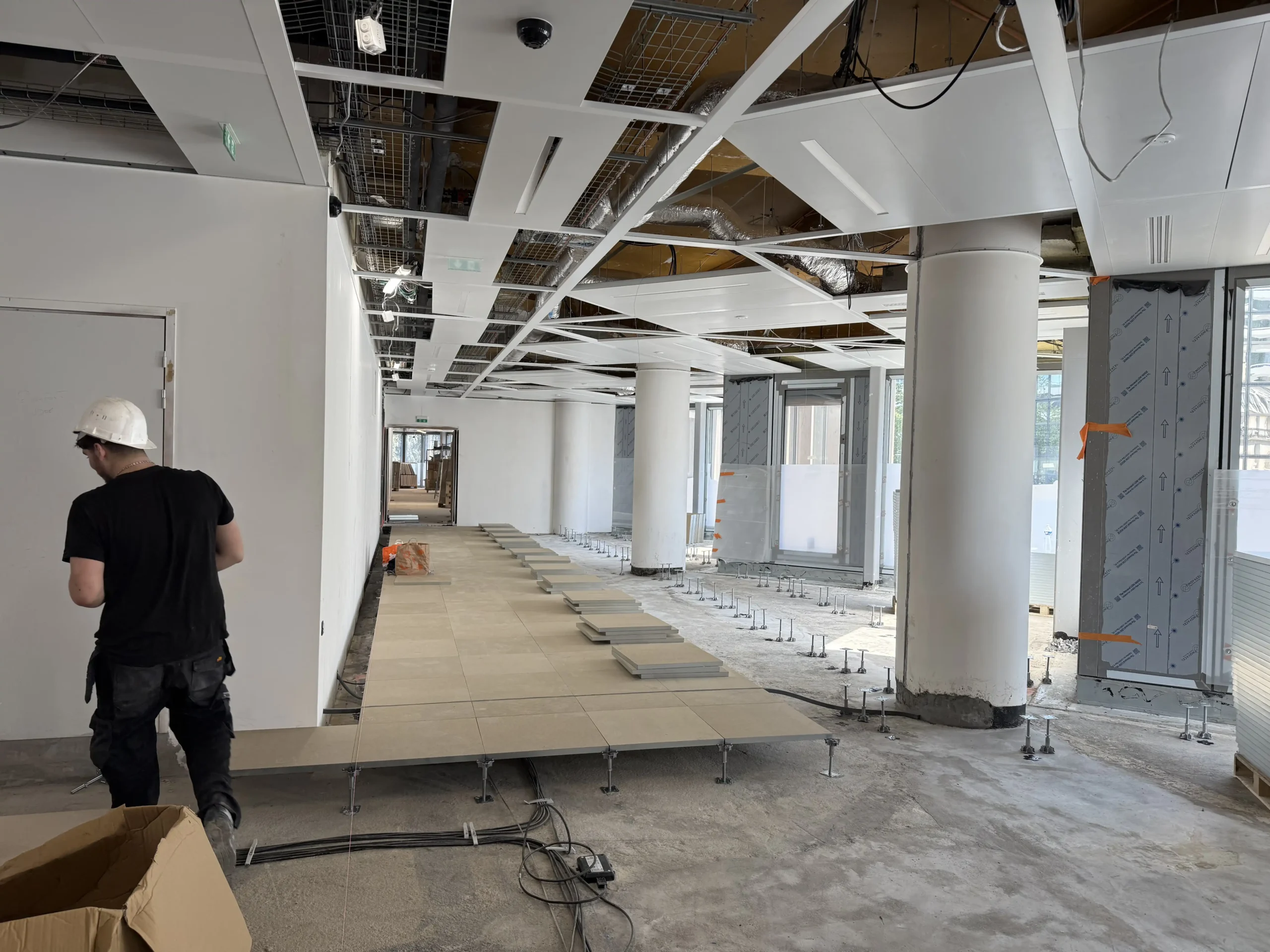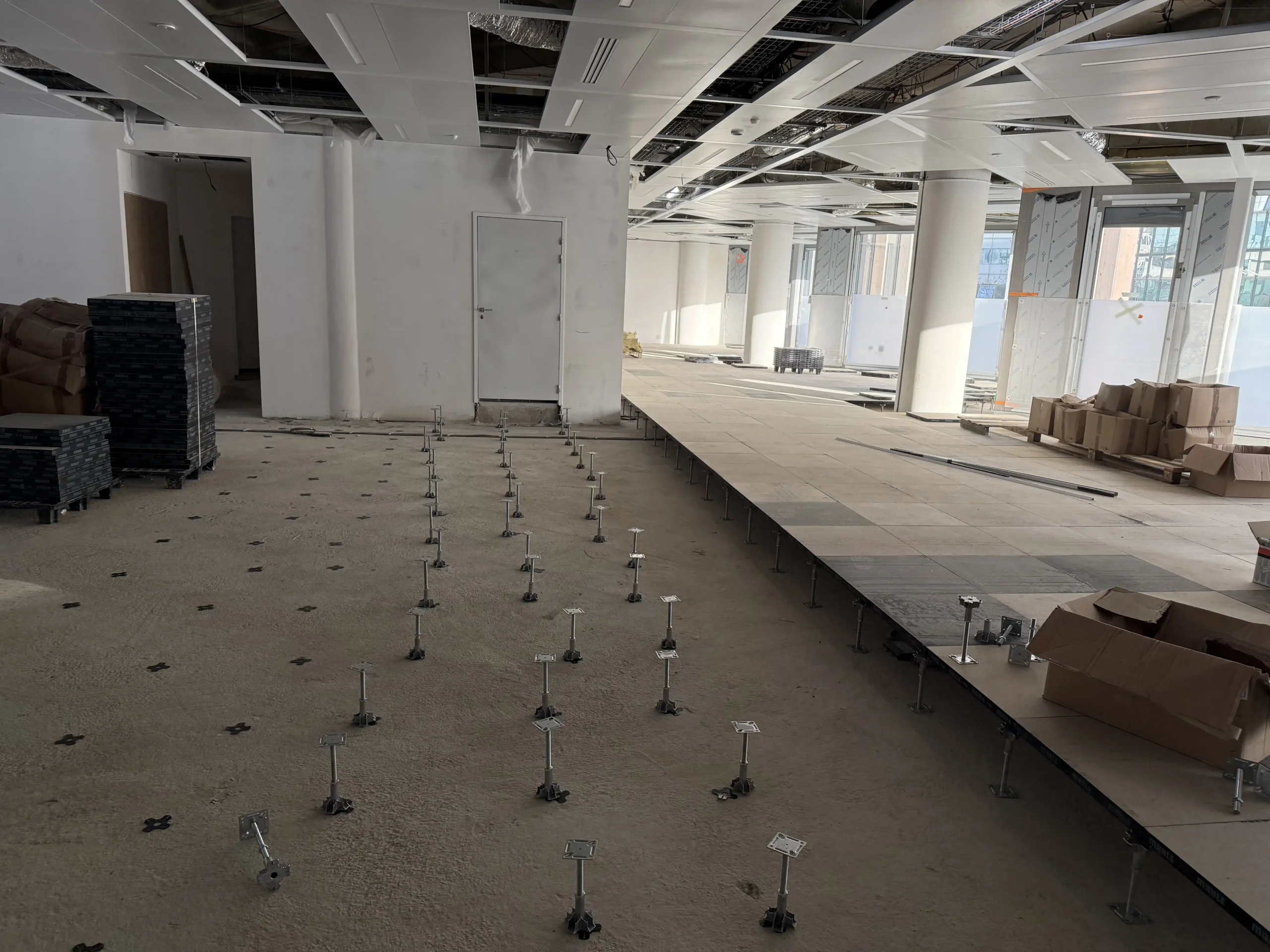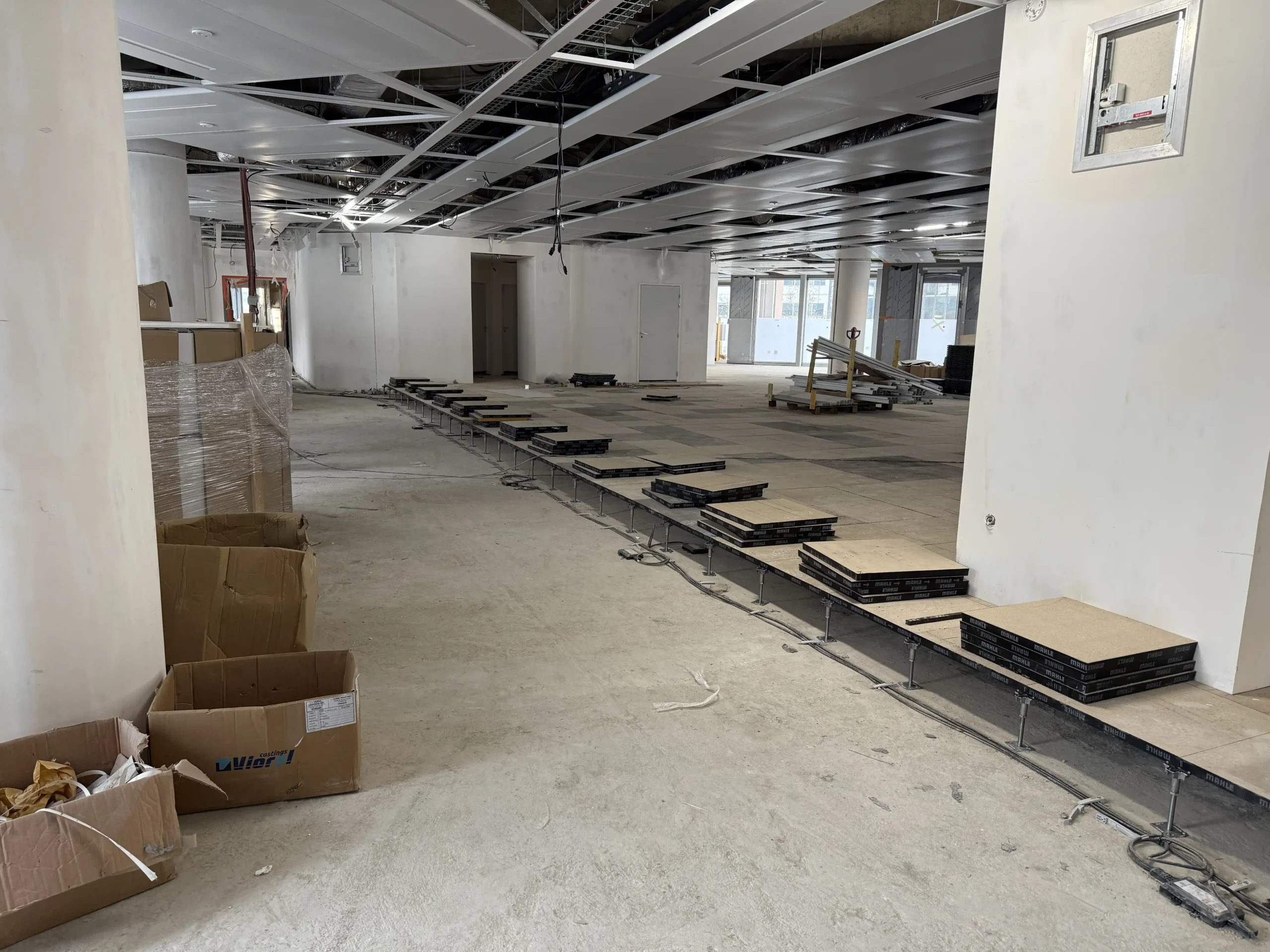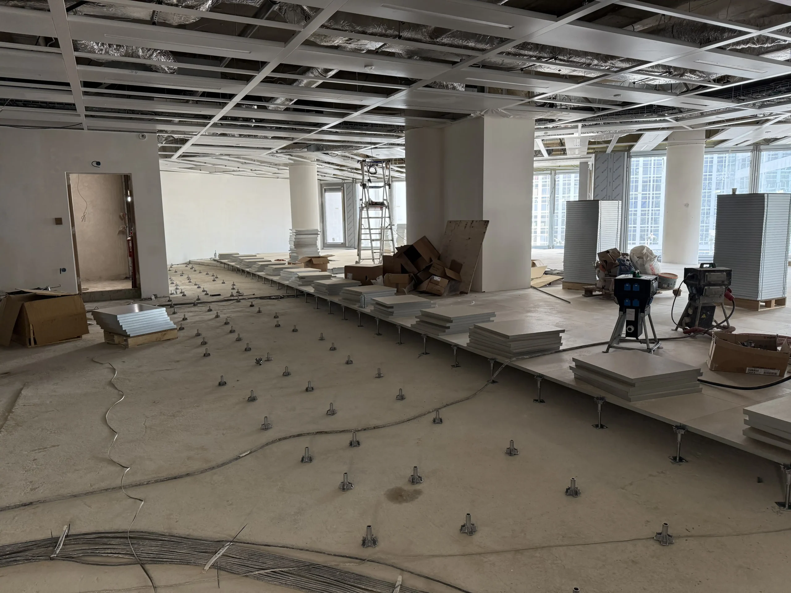 Chantier de faux plancher technique neuf et de réemploi, en dalles agglomérées posées sur un plénum de 50 à 200 mm.