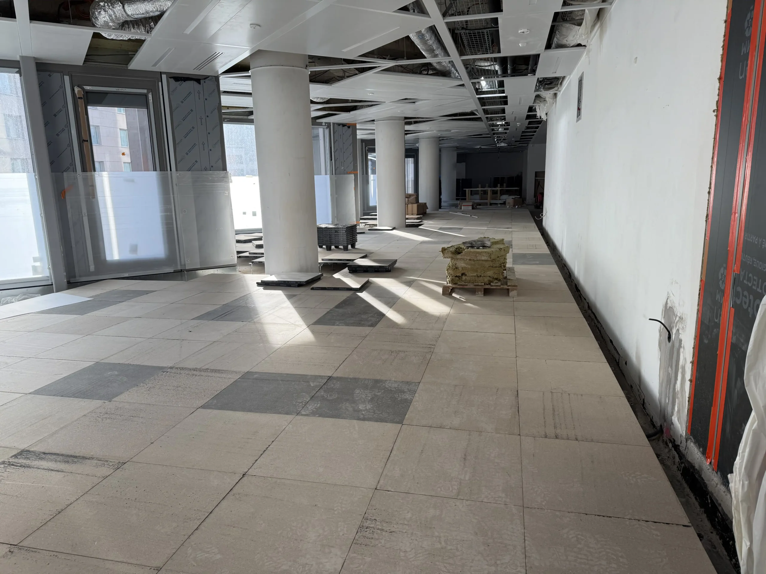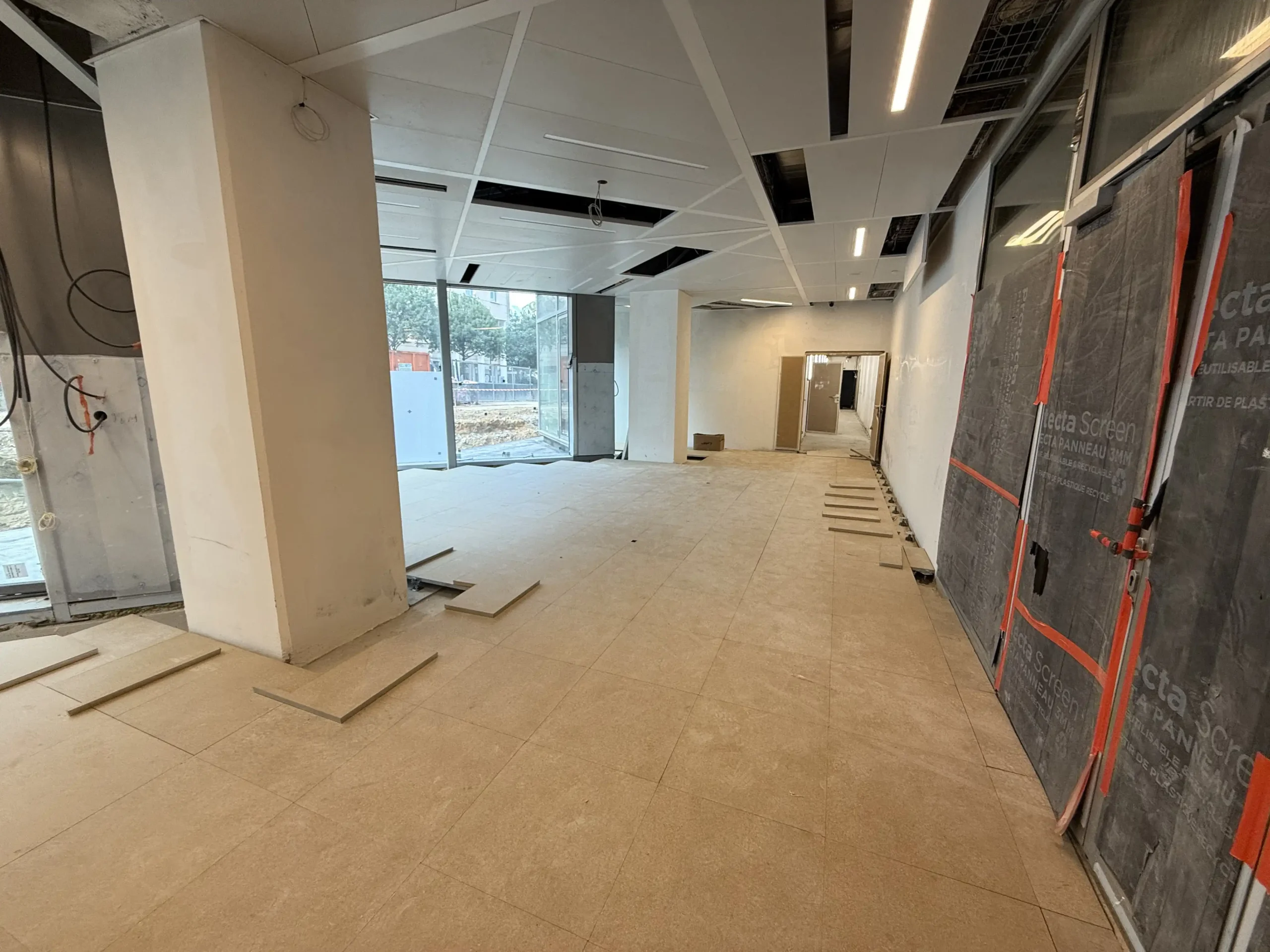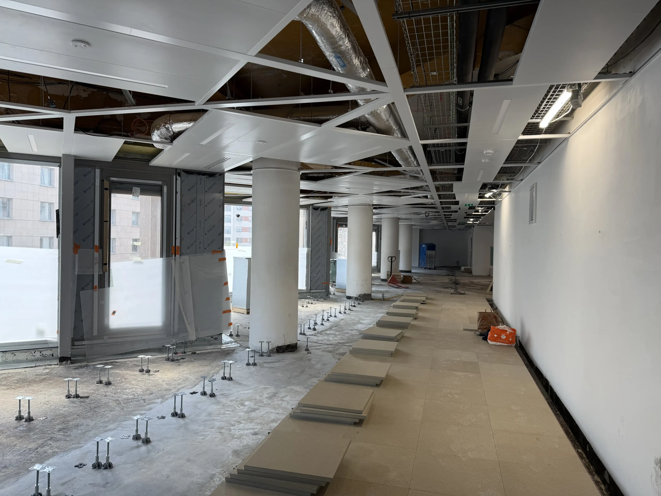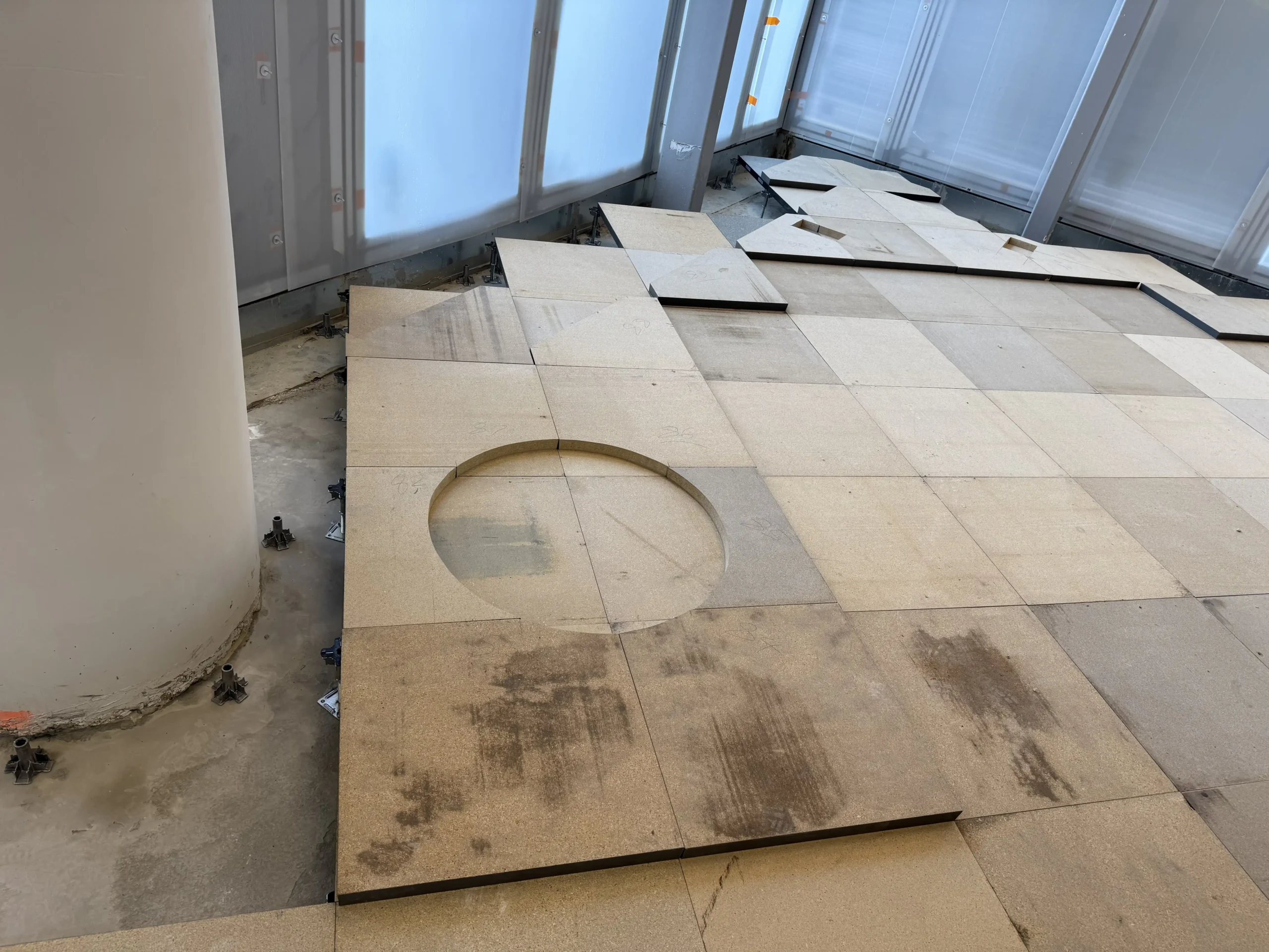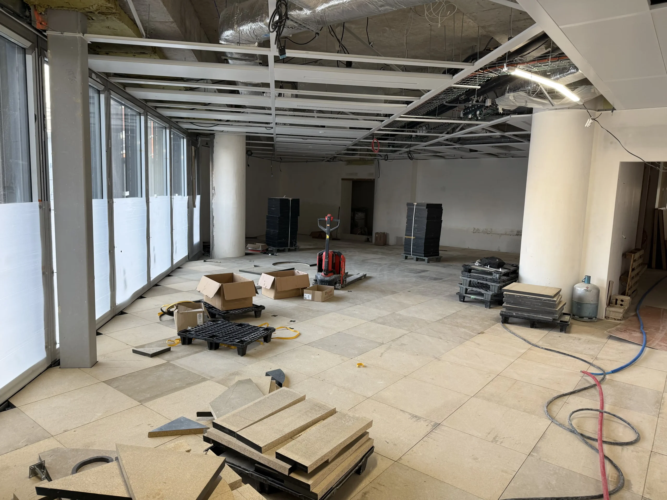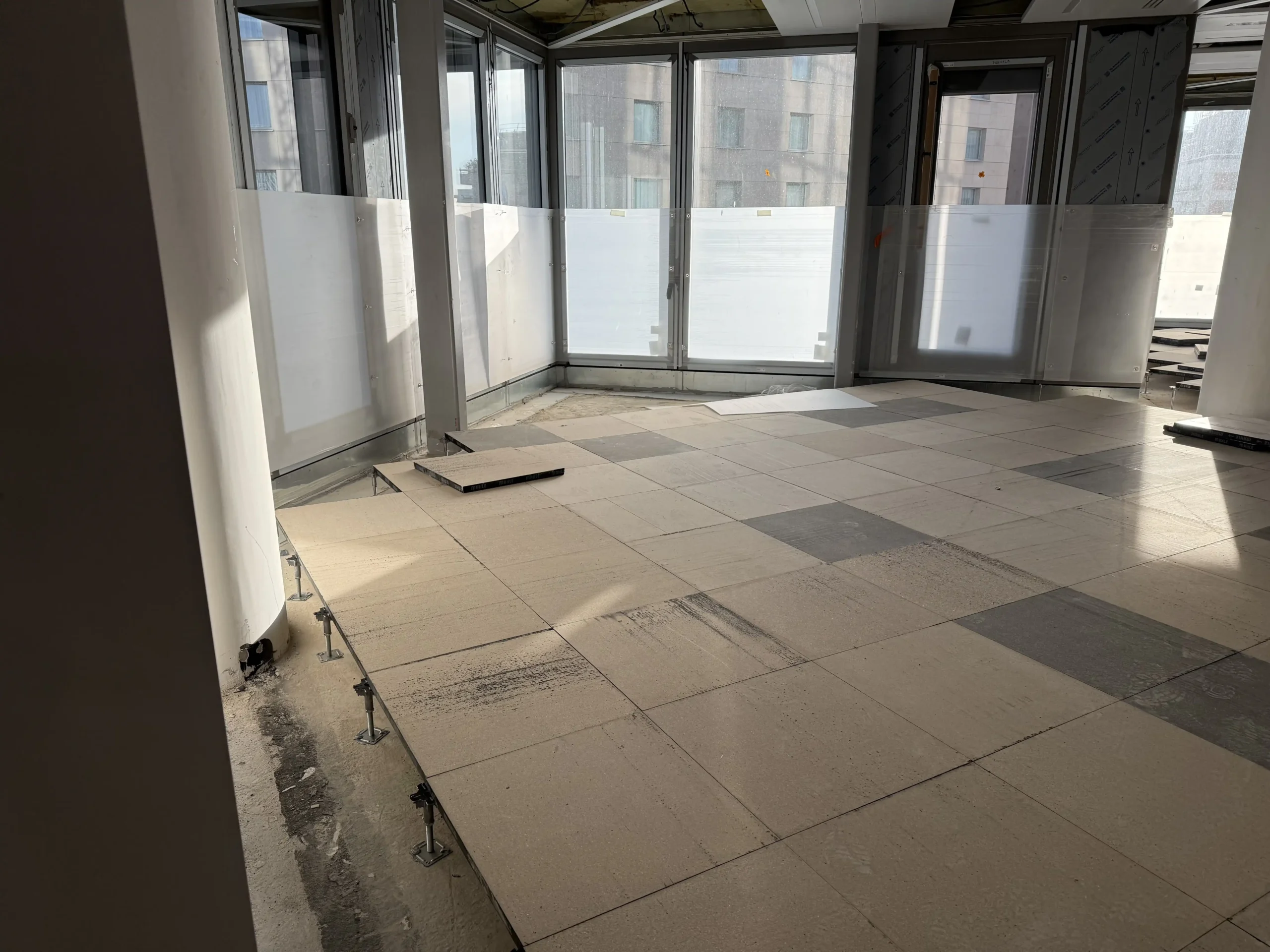 Chantier de faux plancher technique neuf et de réemploi, en dalles agglomérées posées sur un plénum de 50 à 200 mm.