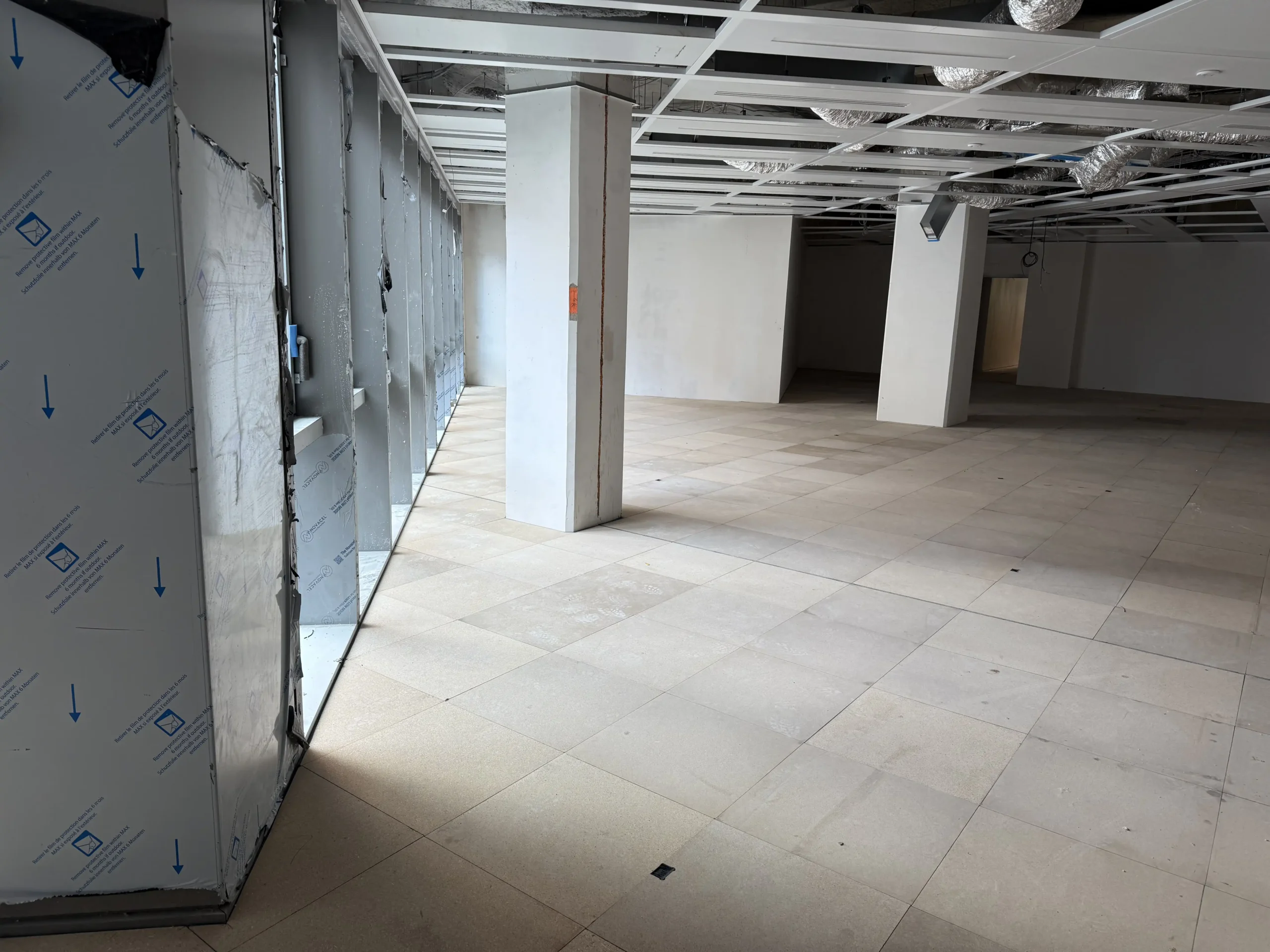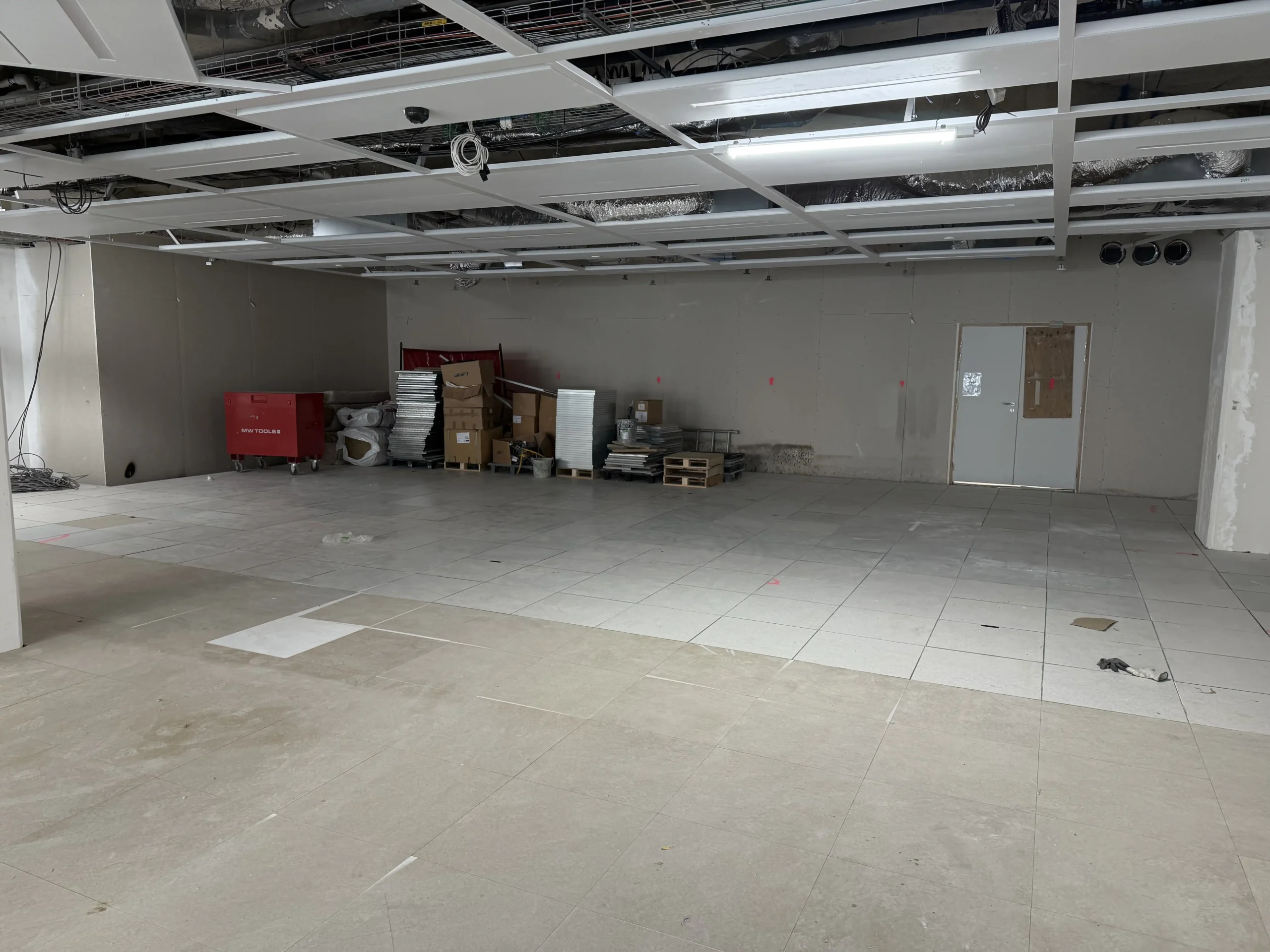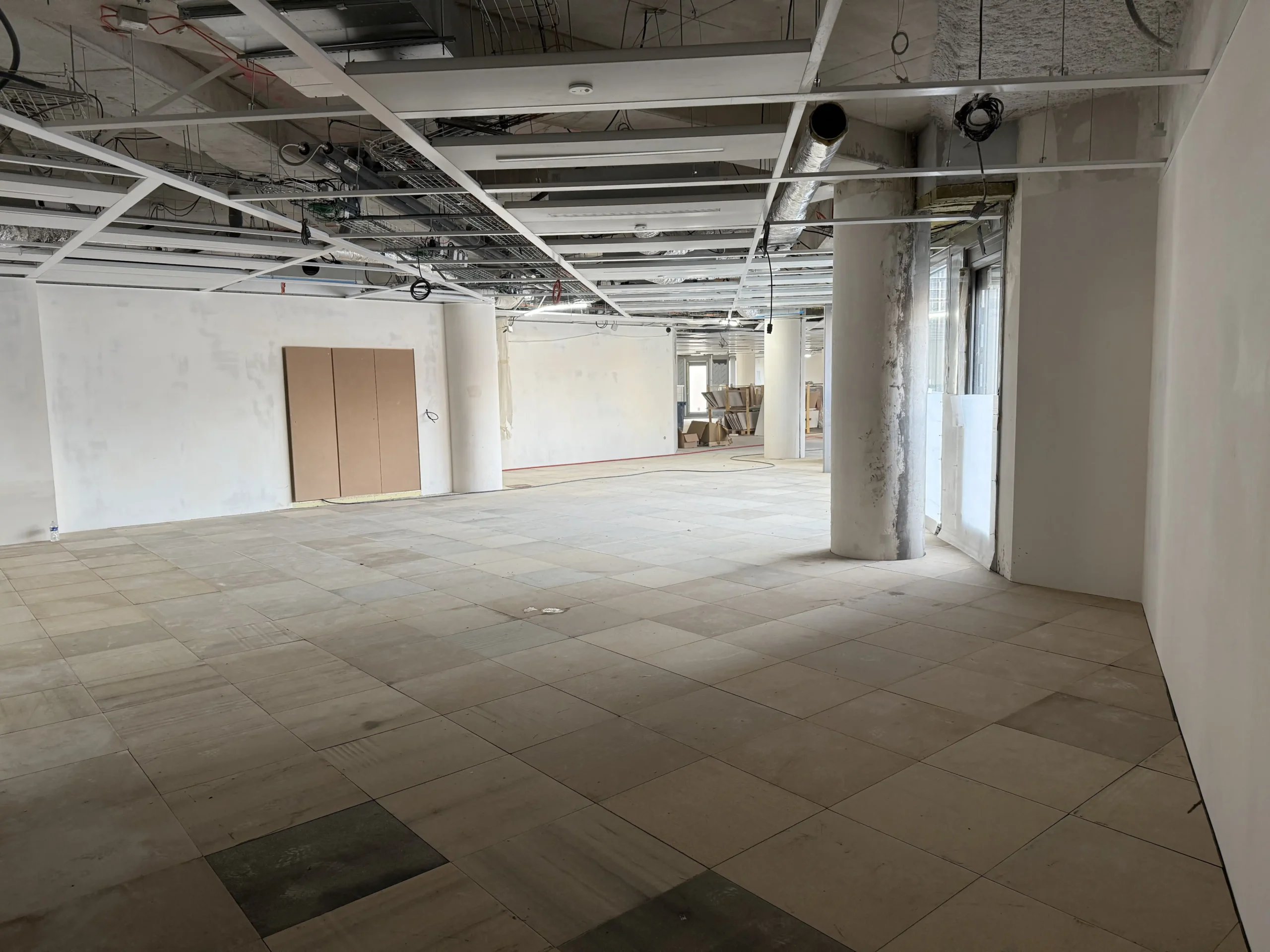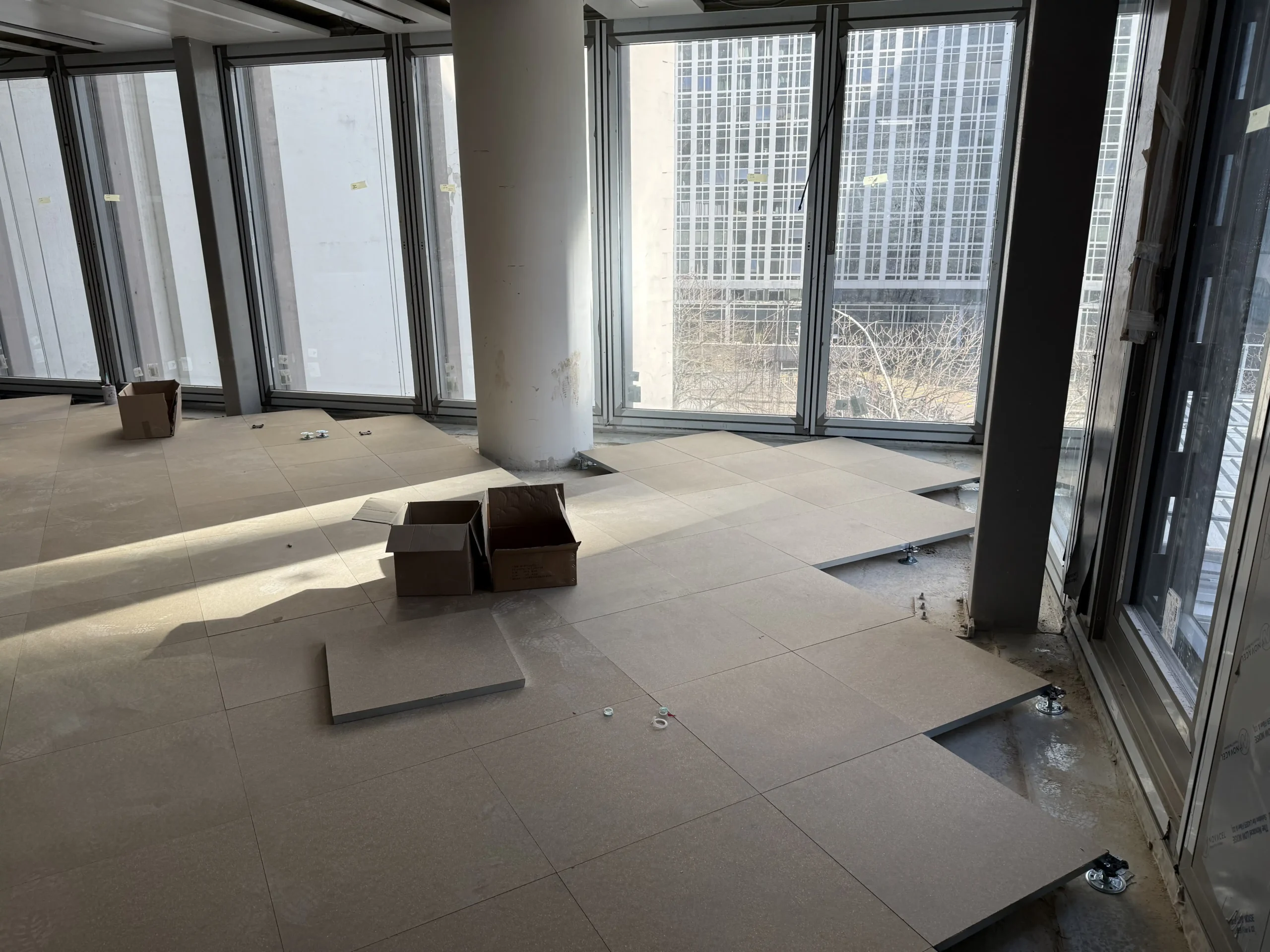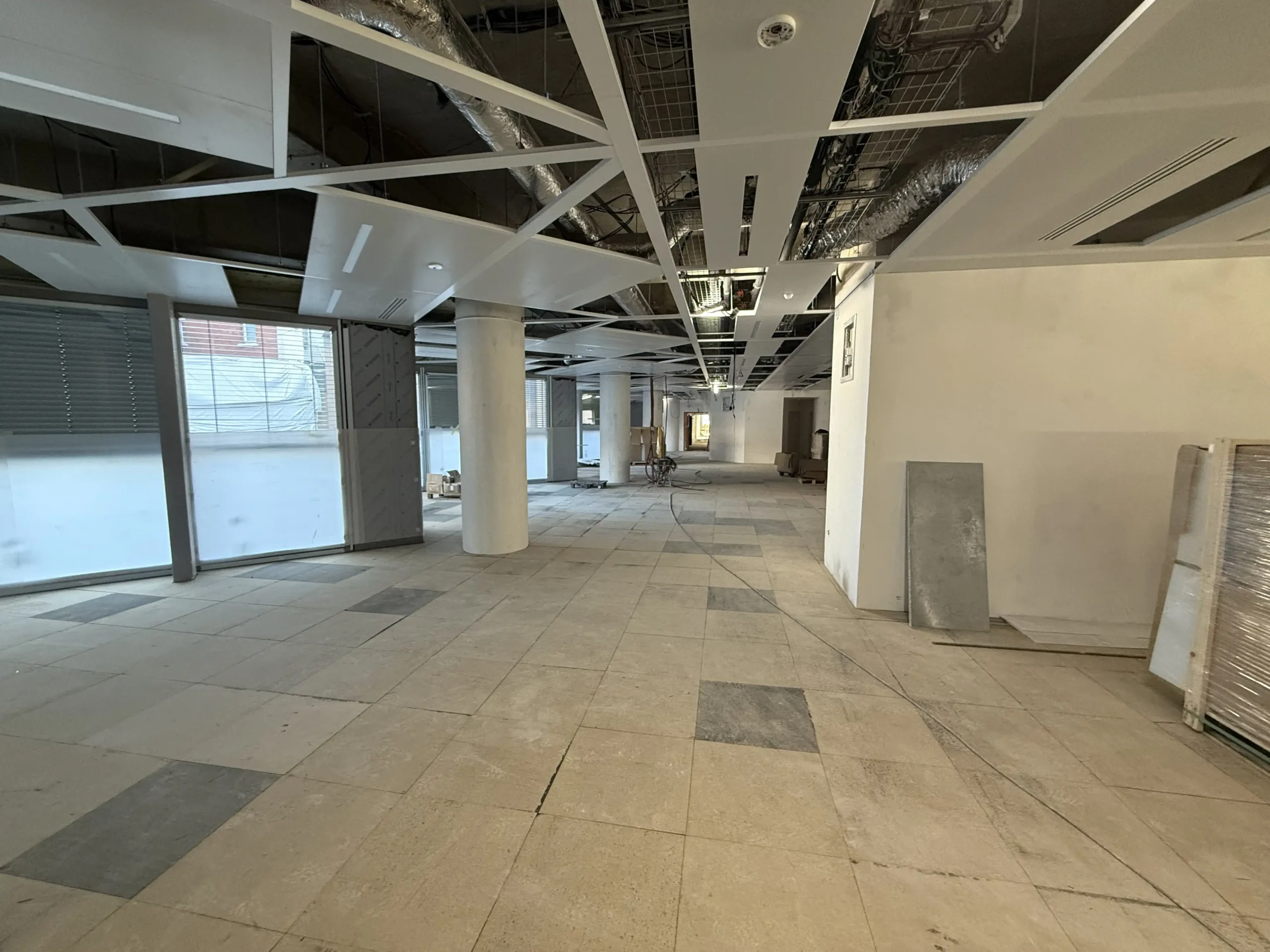 Chantier de faux plancher technique neuf et de réemploi, en dalles agglomérées posées sur un plénum de 50 à 200 mm.