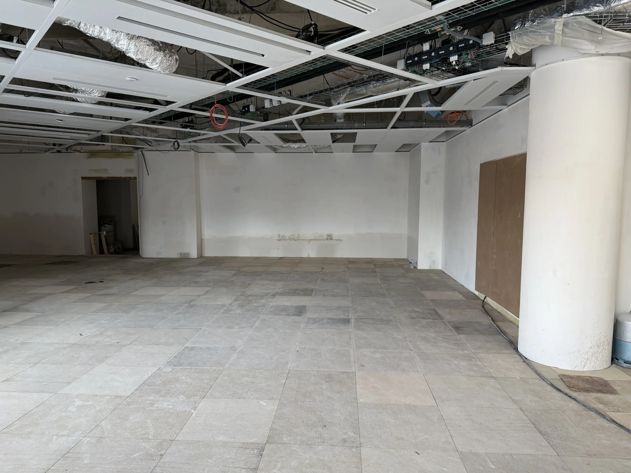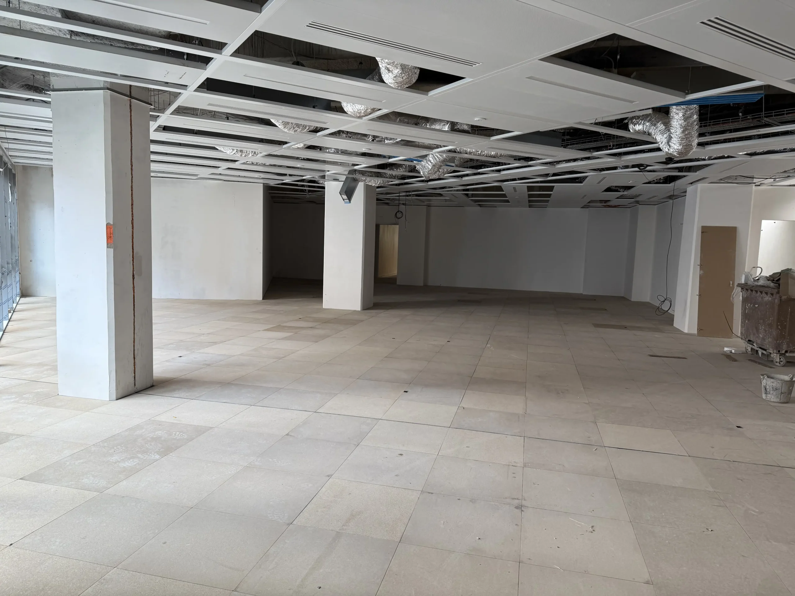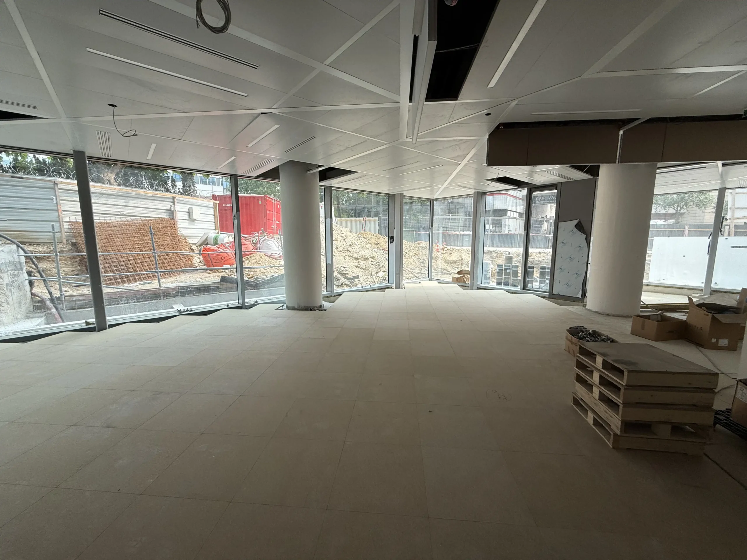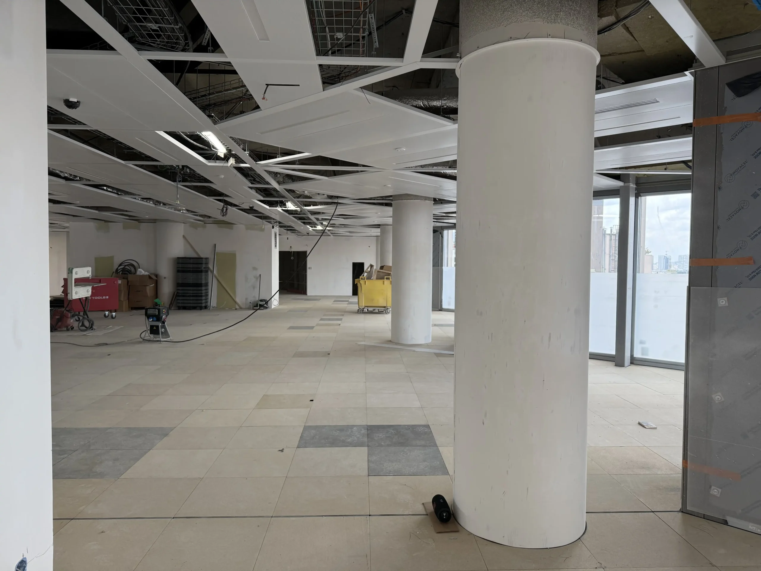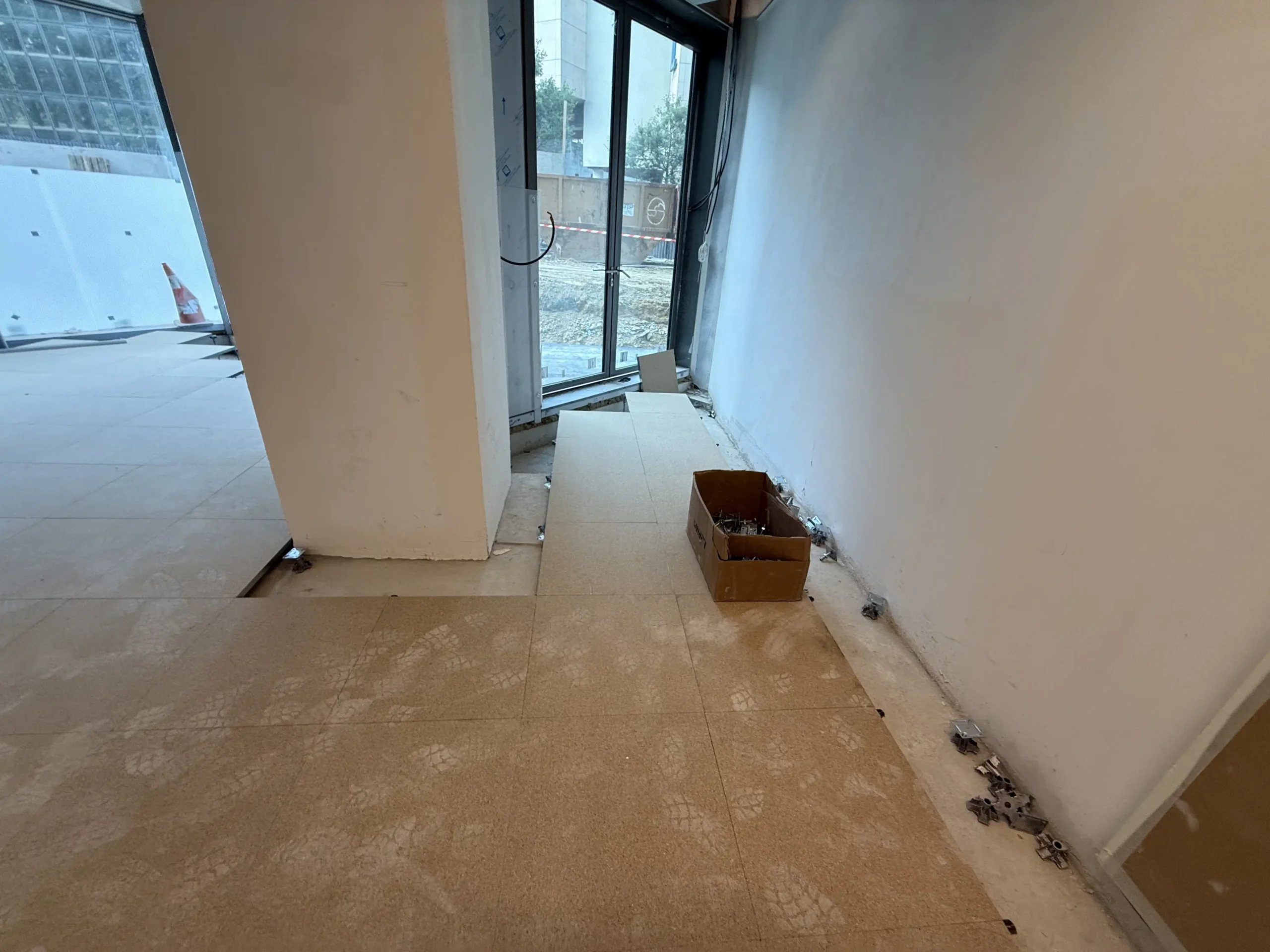 Chantier de faux plancher technique neuf et de réemploi, en dalles agglomérées posées sur un plénum de 50 à 200 mm.