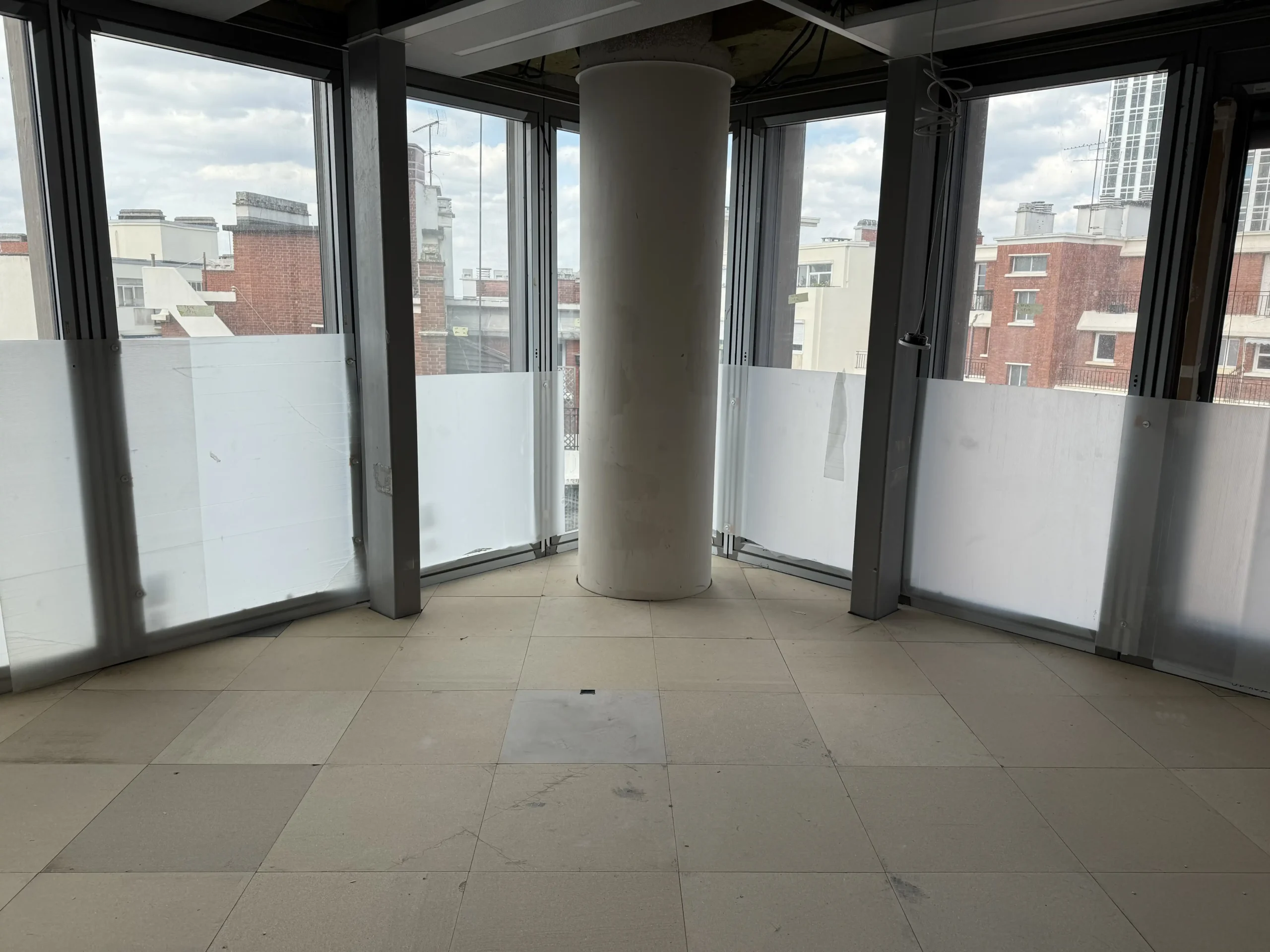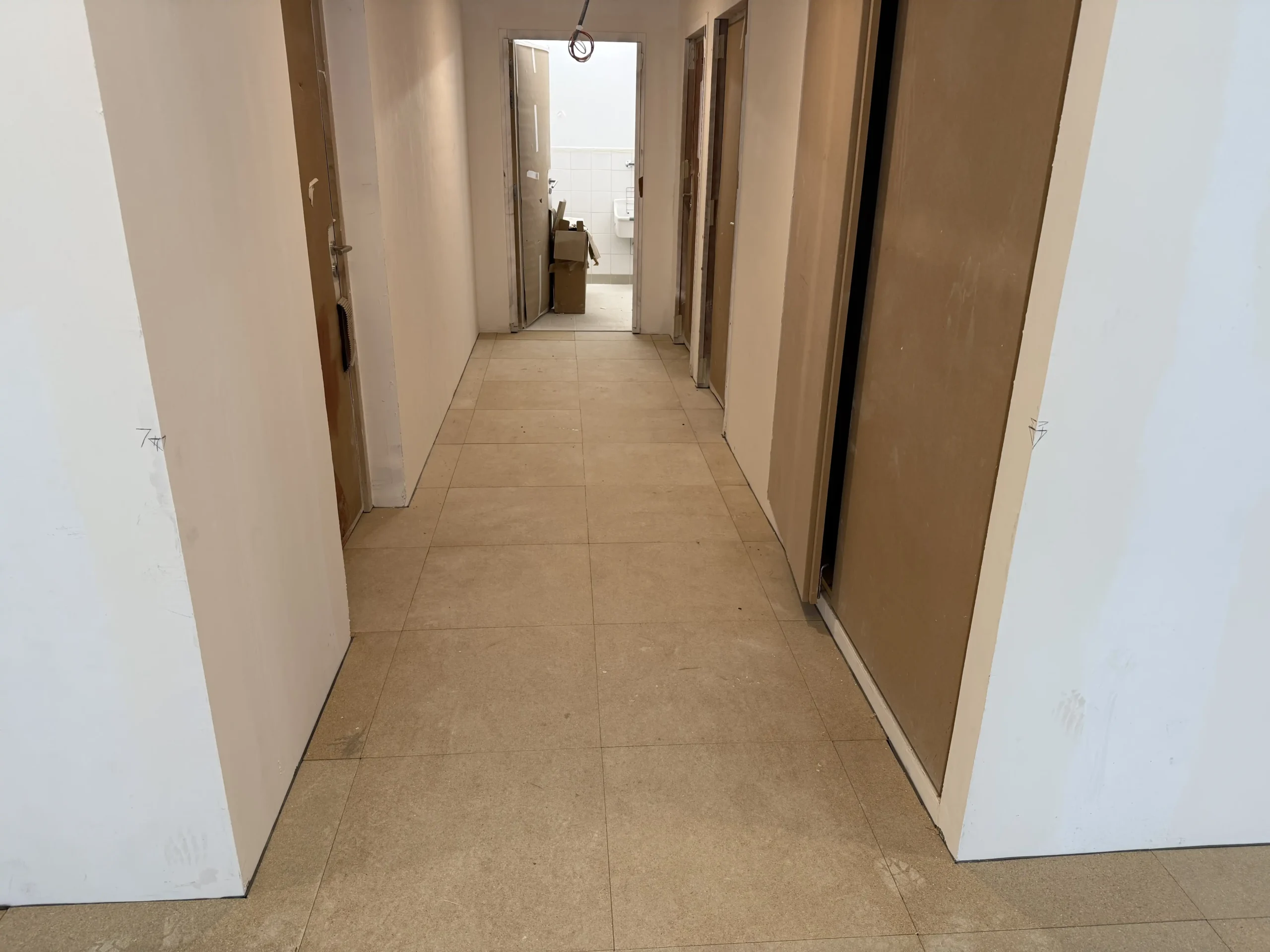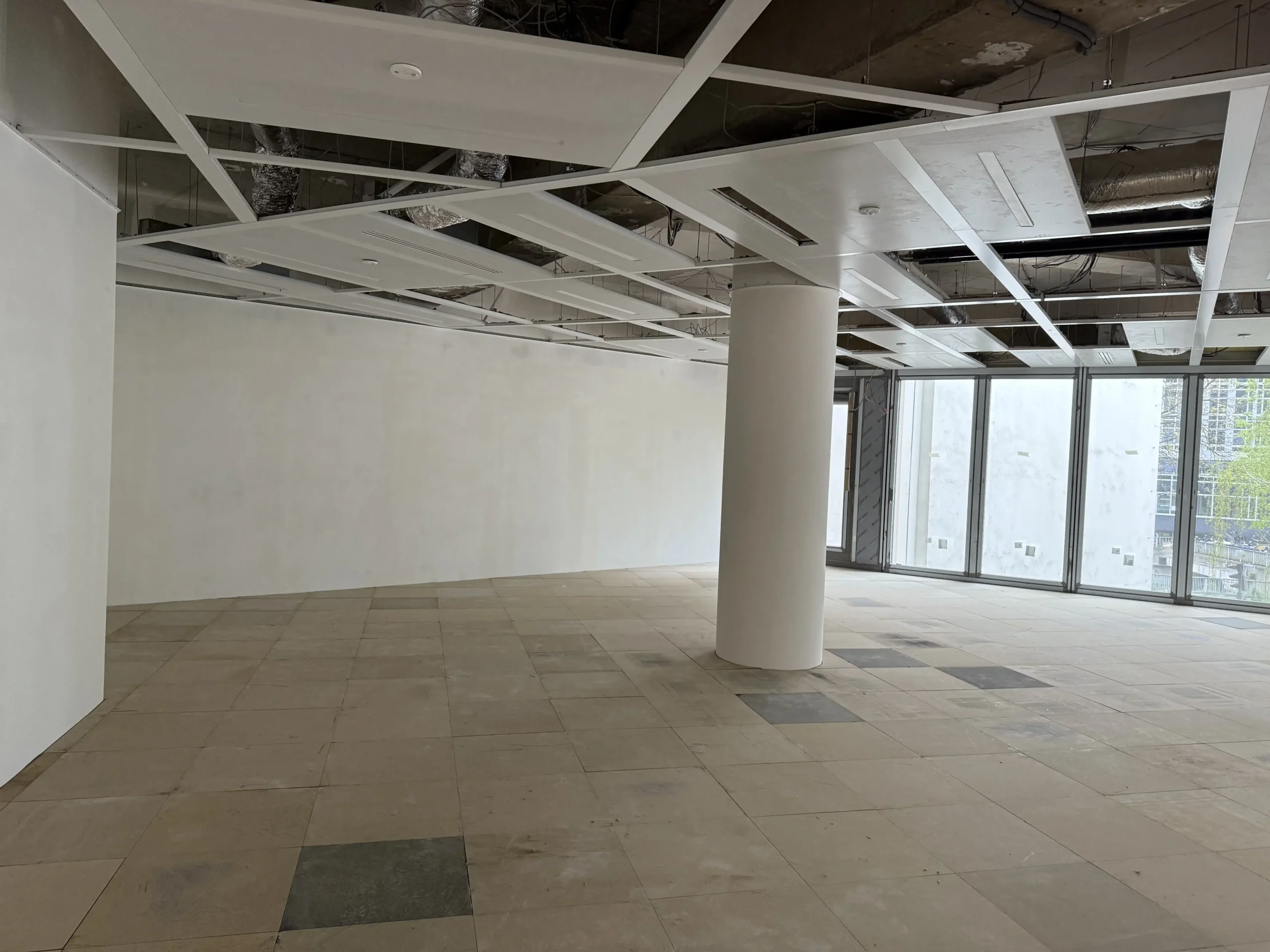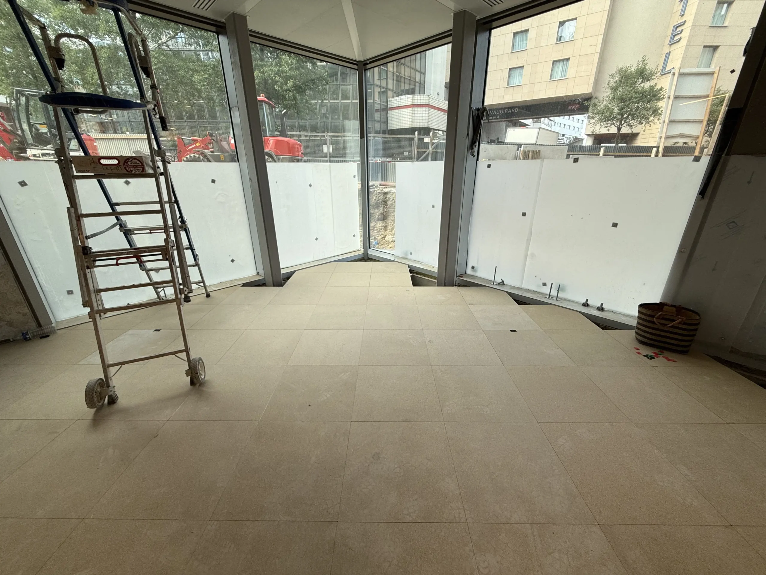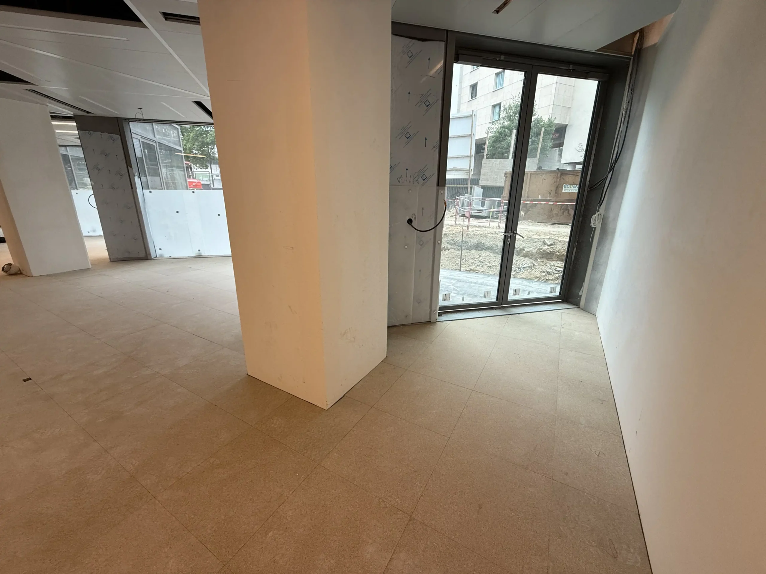 Chantier de faux plancher technique neuf et de réemploi, en dalles agglomérées posées sur un plénum de 50 à 200 mm.